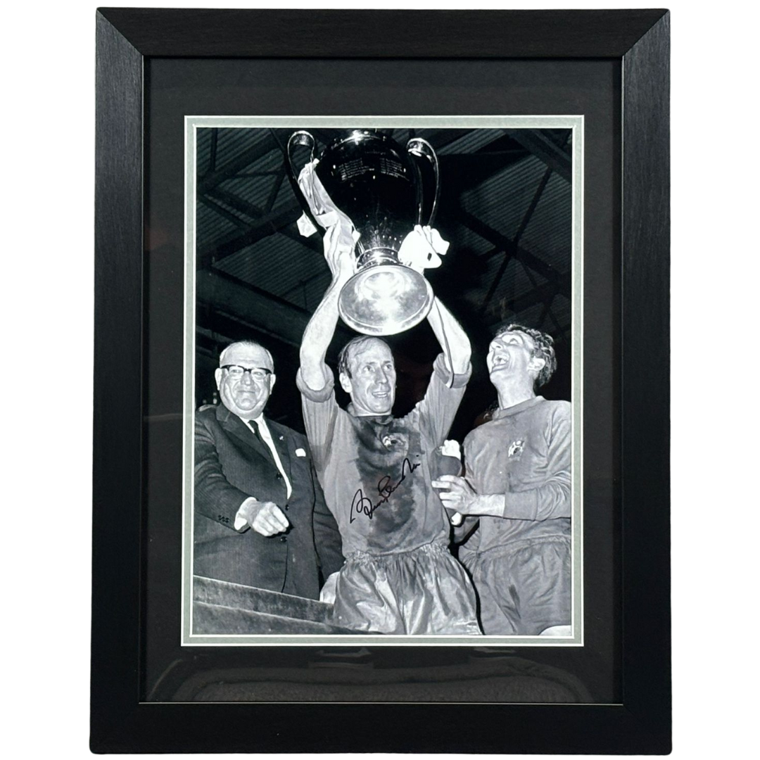 A signed and authenticated Sir Bobby Charlton Manchester United picture, superbly presented in a timeless display frame. Capturing the glory of United’s historic 1968 European Cup triumph, this black-and-white photograph immortalises Sir Bobby lifting the trophy aloft—etched in the hearts of Red Devils fans forever.