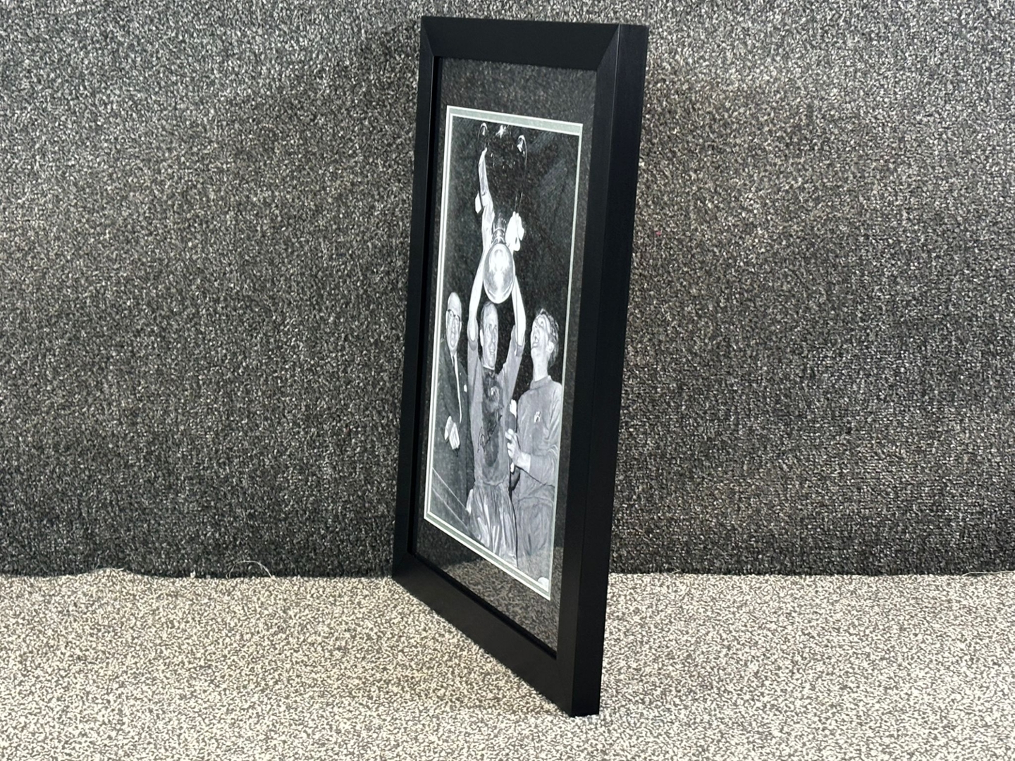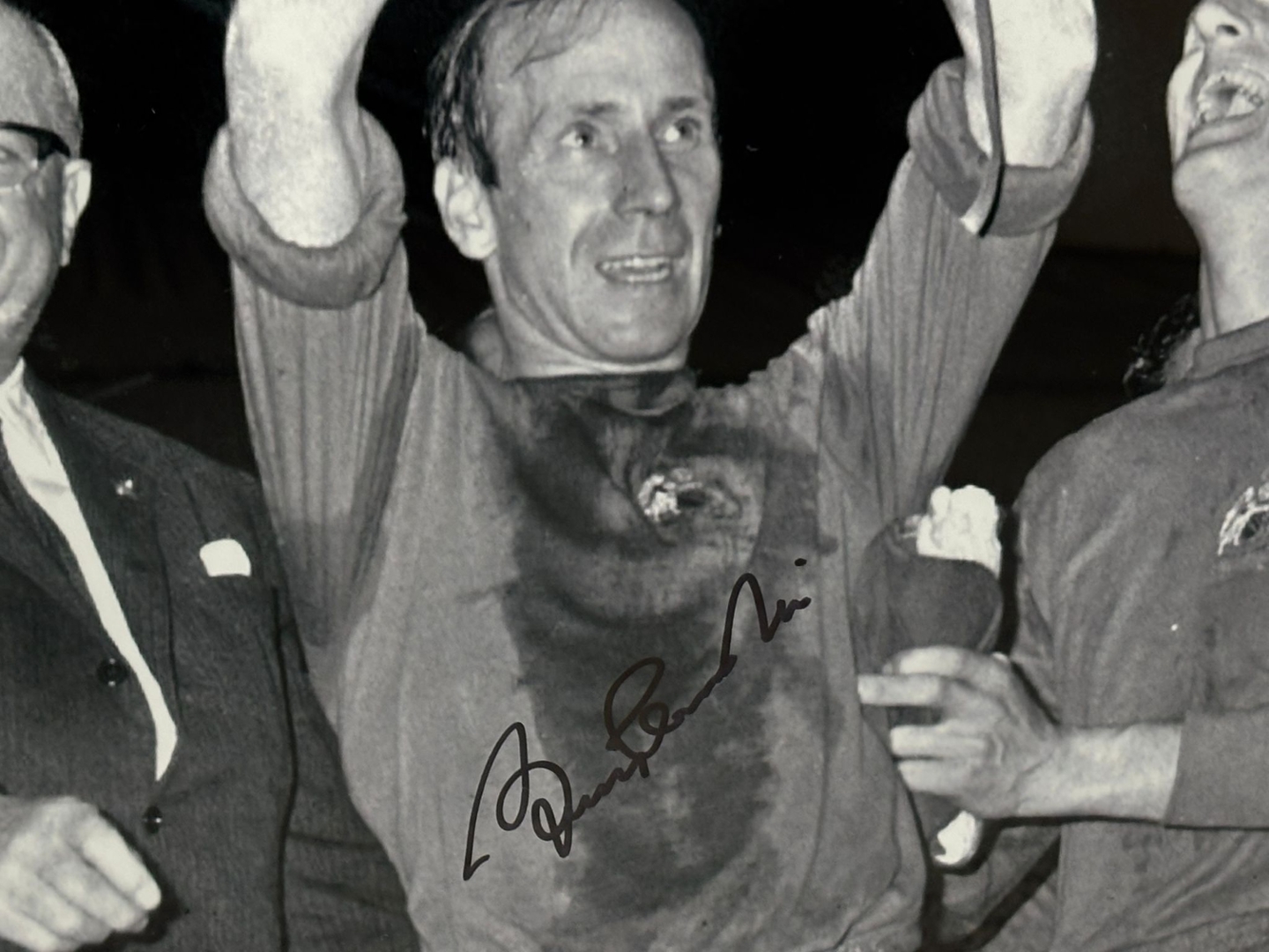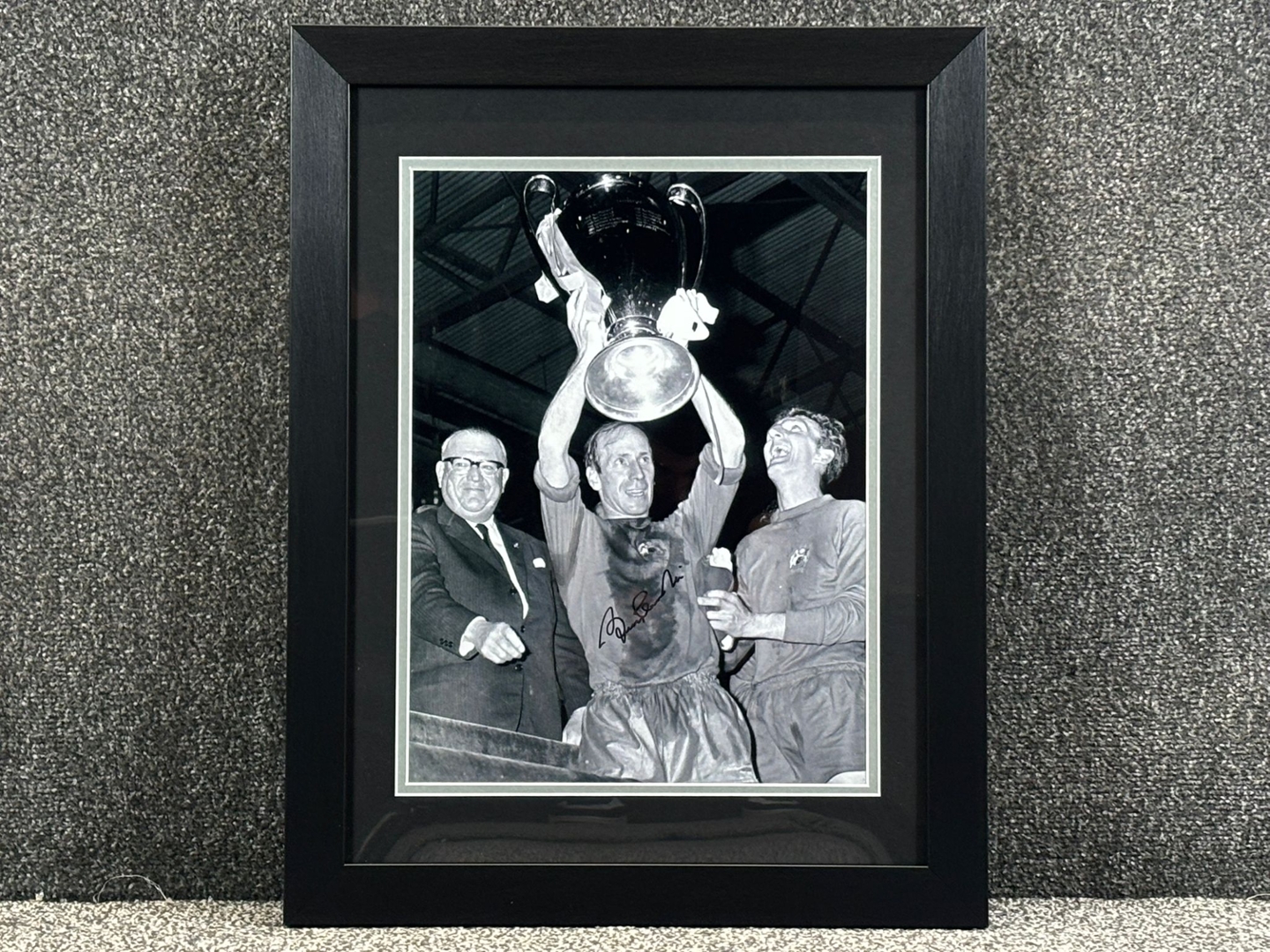 Professionally framed to approximately 57cm in height and 45cm in width, this powerful image features Charlton in jubilant celebration, proudly holding the silverware that marked Manchester United as the first English club to conquer Europe. His signature is prominently placed on the image, adding a personal touch to an already legendary scene.