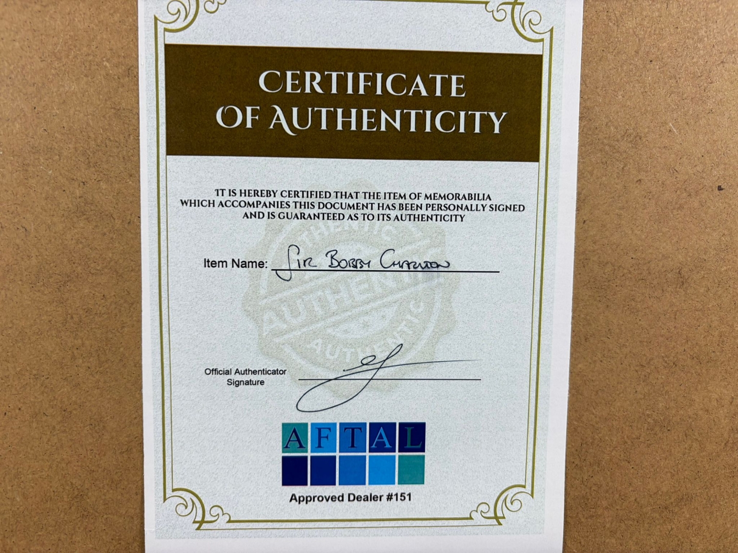 Fully authenticated and framed with classic black and silver trim, this piece is a must-have for any devoted United supporter or collector of football history. A stirring tribute to a true gentleman of the game and one of the sport’s most enduring heroes.
