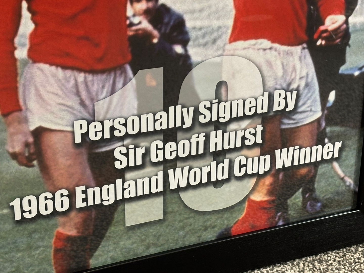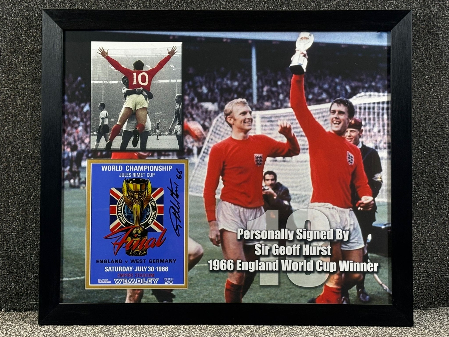 A Sir Geoff Hurst signed and authenticated picture and programme montage, presented in a striking display frame. Celebrating the legendary 1966 World Cup Final, where Hurst made history as the only player to score a hat-trick in a World Cup final, this tribute captures the spirit and pride of England’s greatest footballing triumph.