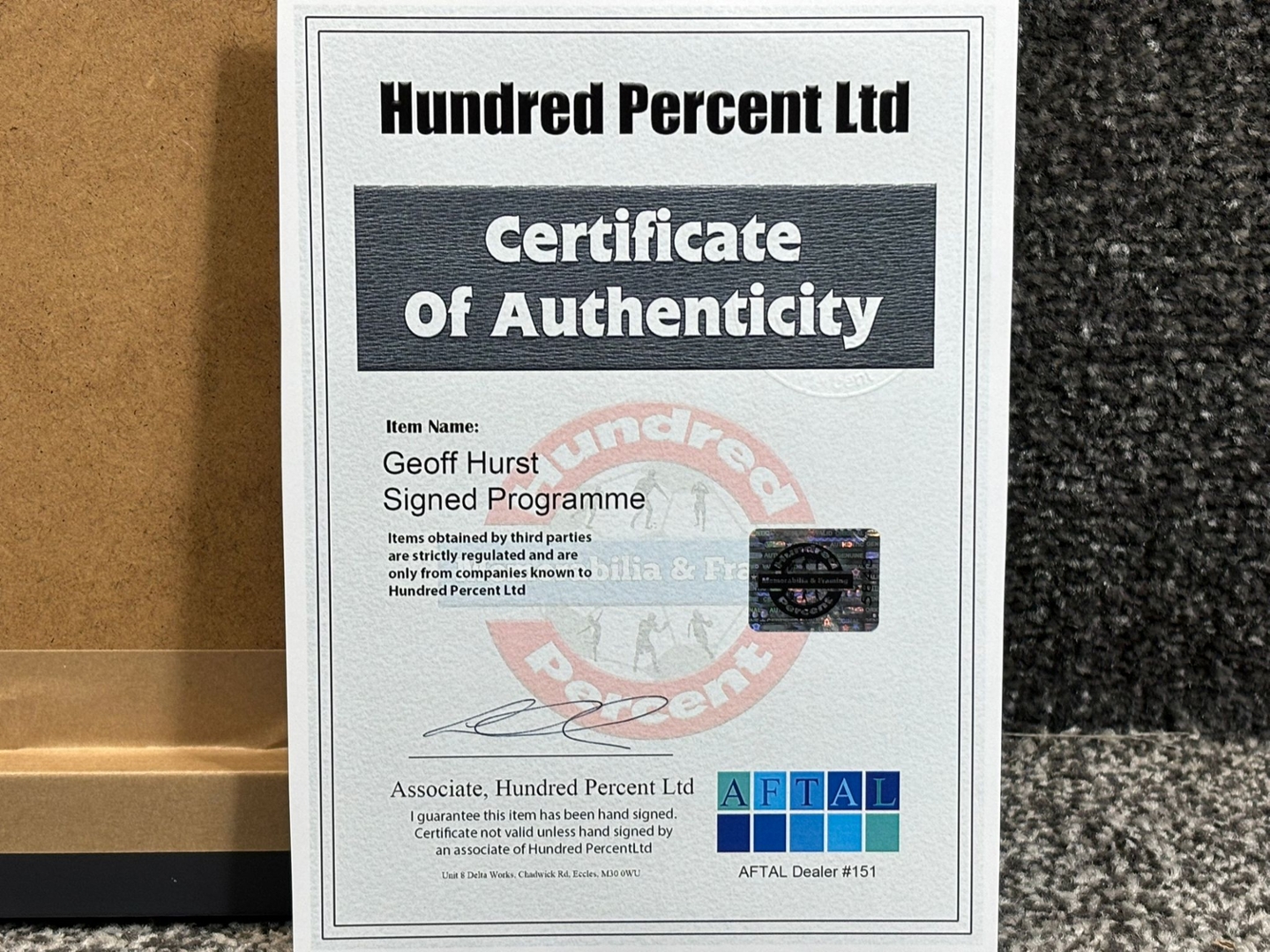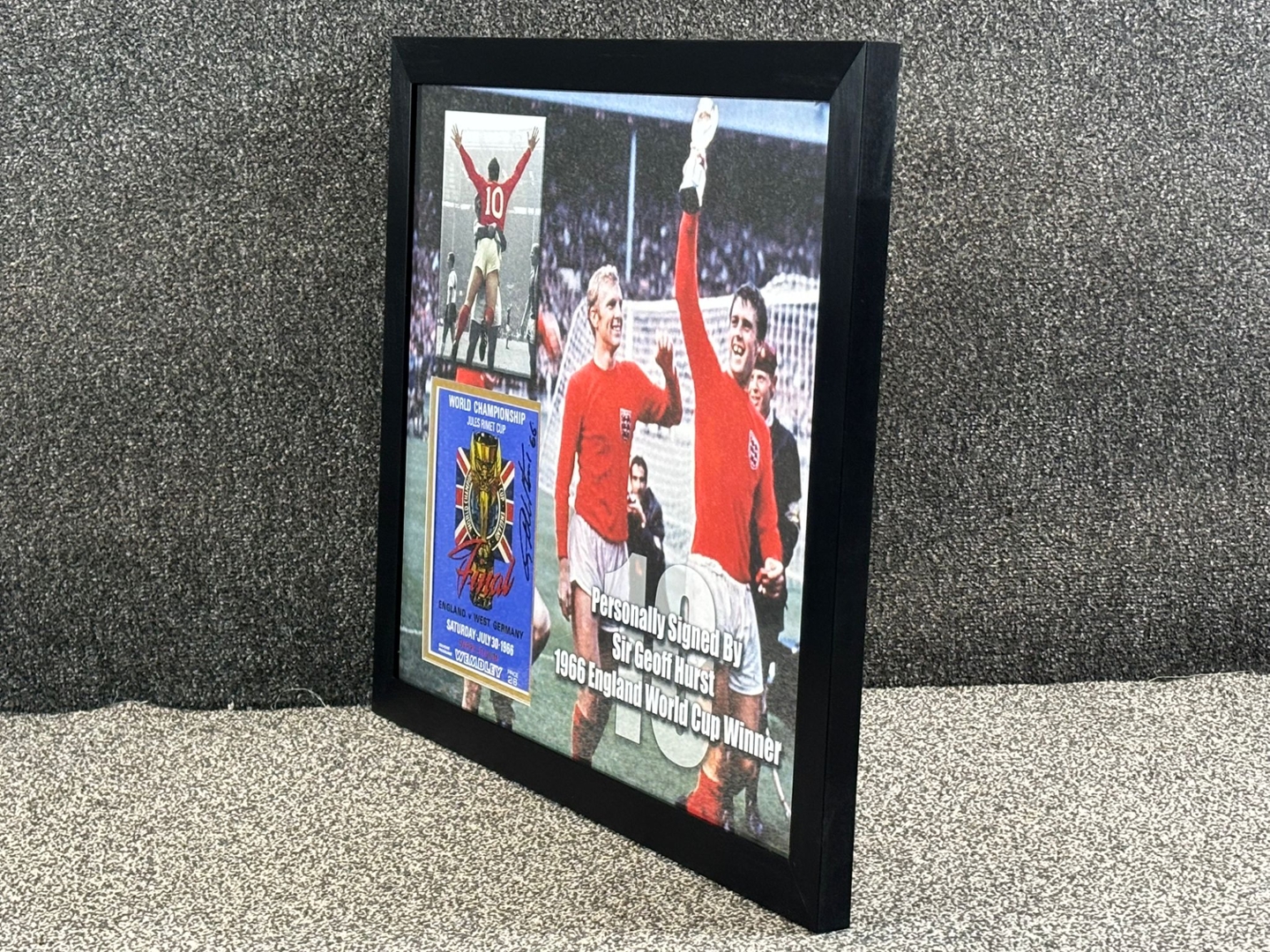 A signed and authenticated Sir Geoff Hurst Picture & Programme Montage in a presentation frame. Approx 57cm height, 68cm width.