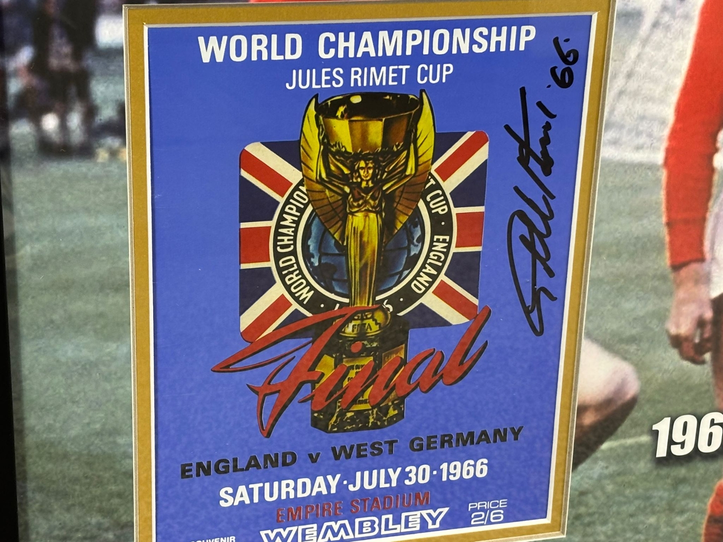 Beautifully framed to approximately 57cm in height and 68cm in width, the presentation includes an original reproduction of the iconic World Cup Final programme cover, signed by Sir Geoff Hurst himself. Complemented by powerful imagery of the unforgettable Wembley victory and jubilant celebrations, this piece evokes the drama, glory, and national pride of that historic day. Authenticated for complete assurance, this exclusive item is perfect for collectors and fans alike. A true centrepiece for any football enthusiast, this montage pays homage to one of the most defining moments in England's sporting heritage.
