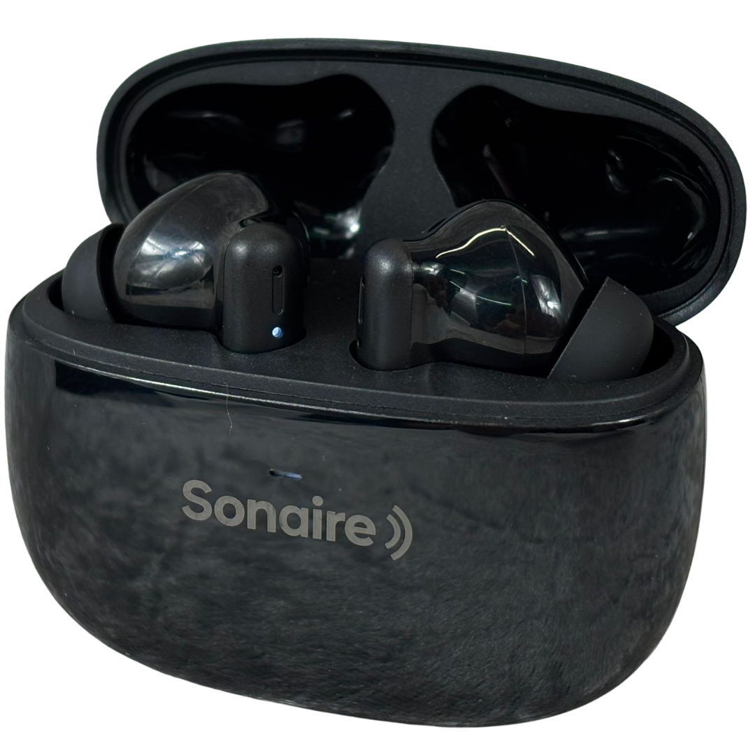 A brand new Sonaire wireless earbuds set presented in a sleek black finish, combining modern design with everyday practicality. Housed in a compact charging case, these earbuds offer a refined, minimalist look while delivering comfortable in-ear wear for extended listening sessions.