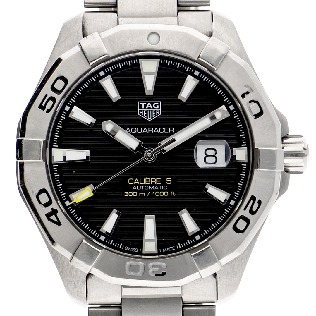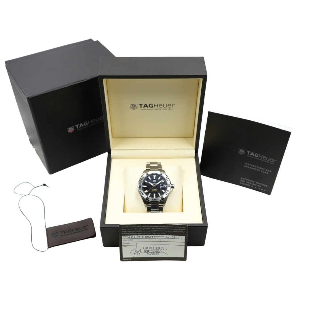 A Tag Heuer Aquaracer reference WAY2010 in stainless steel with a black dial, presented boxed and certified with original TAG Heuer paperwork. The 43mm case features the signature unidirectional bezel with bold, engraved numerals, delivering a strong, purposeful dive-watch aesthetic. The black horizontal textured dial enhances legibility, complemented by luminous baton hour markers and a date aperture at 3 o’clock.