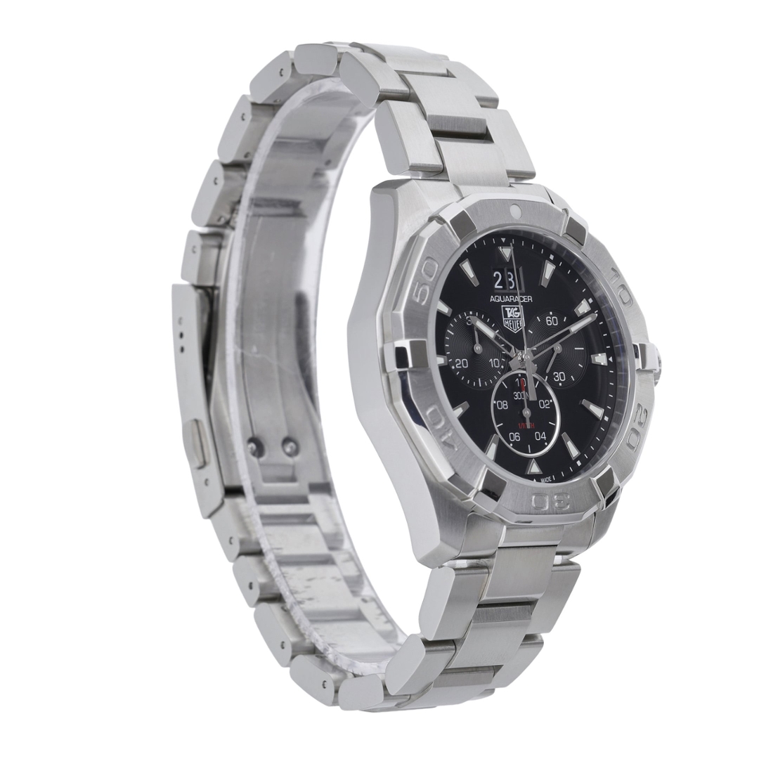 A Tag Heuer Aquaracer Chronograph, reference CAY1110, crafted in stainless steel with a bold black dial and matching engraved bezel. The 43mm case delivers a strong wrist presence, while the unidirectional diving bezel and 300-metre water resistance reinforce its professional sports credentials. The dial features luminous baton hour markers, three chronograph sub-dials, and a prominent double-date display at 12 o’clock, creating a balanced and highly legible layout suited to both daily wear and active use.