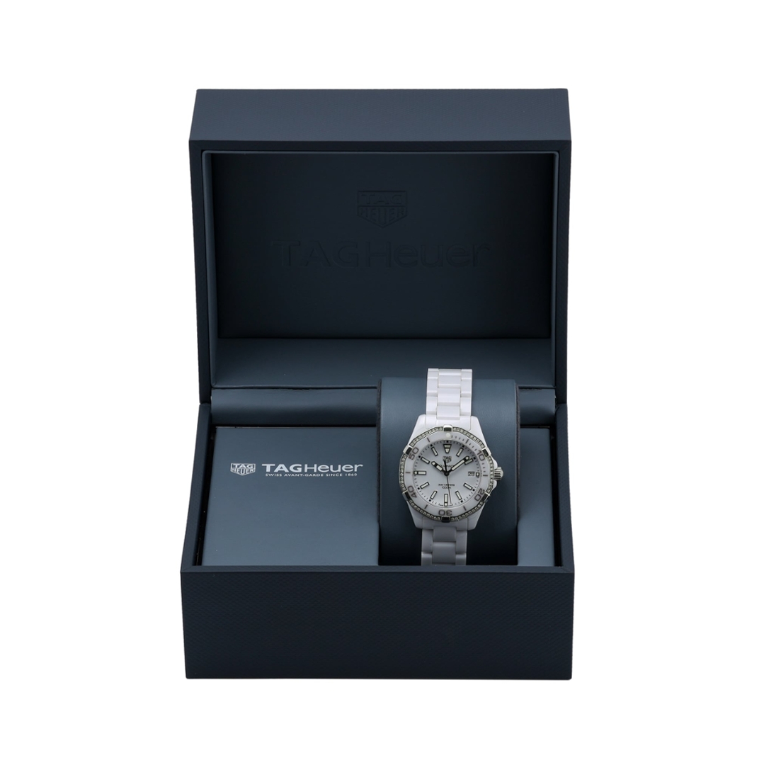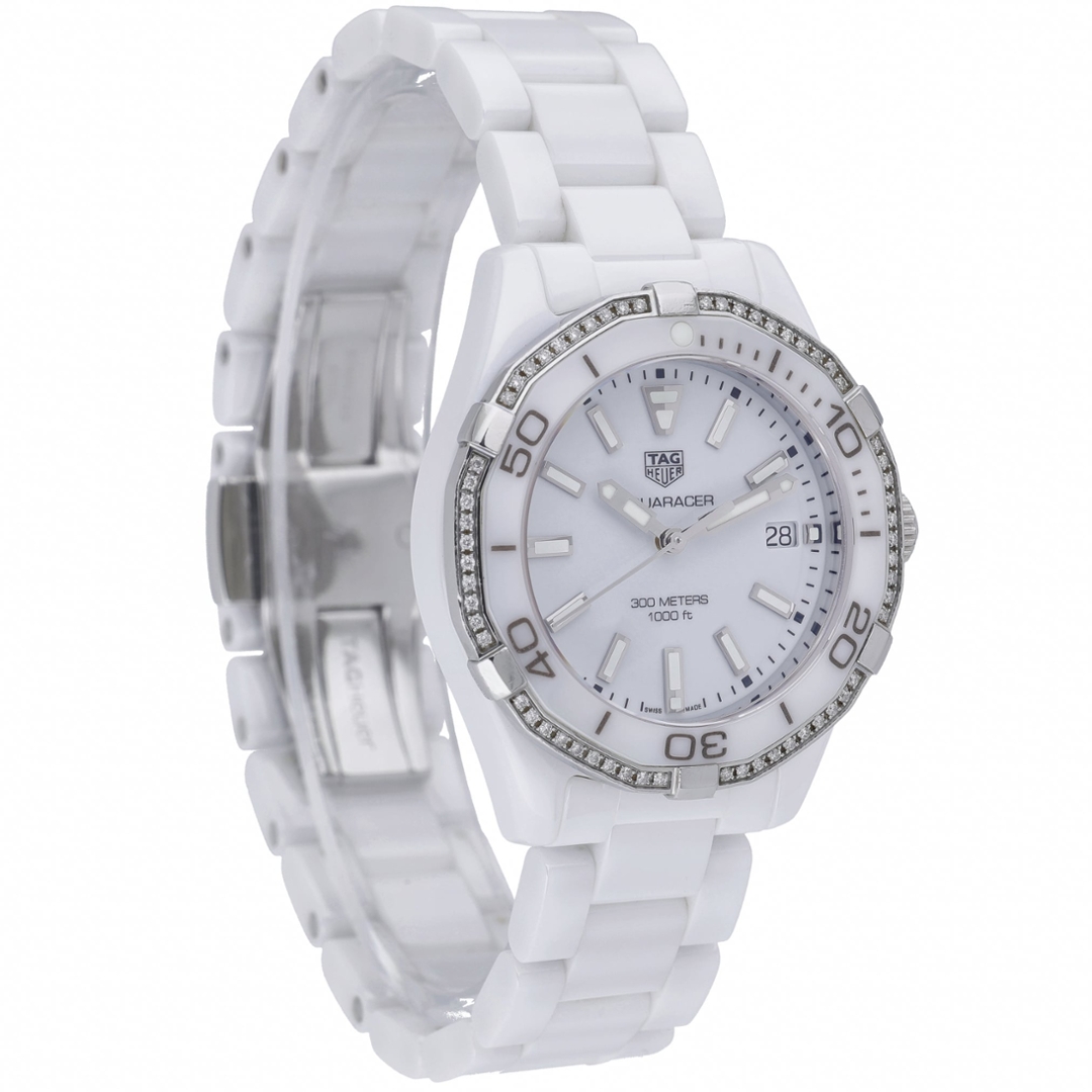 A Tag Heuer Aquaracer Watch, White Ceramic with a Diamond Bezel on a White Dial