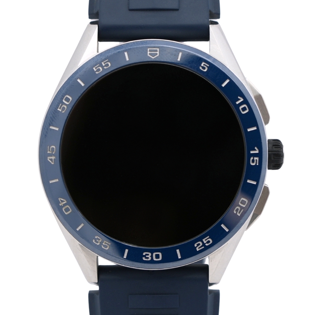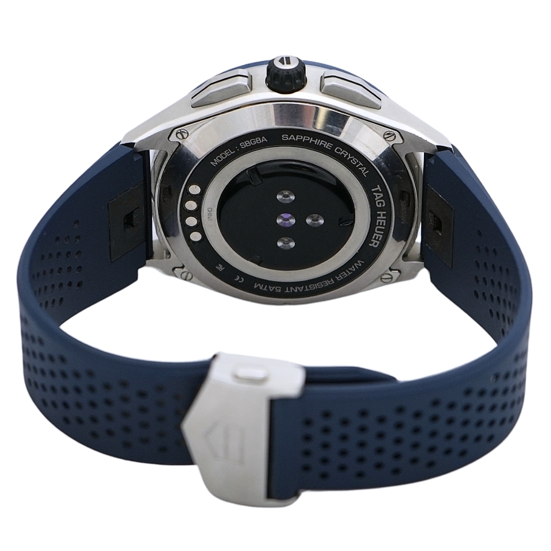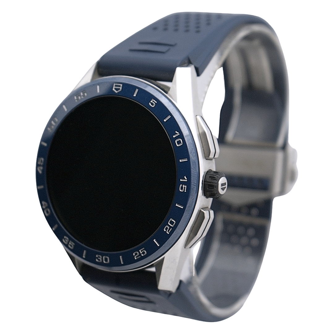 A Tag Heuer Connected Watch, model SBG8A11, is a masterful blend of luxury and technology designed to meet the demands of a modern lifestyle. A substantial 45mm steel case exudes sophistication and strength, while the striking blue ceramic bezel and touchscreen, protected by scratch-resistant sapphire crystal, adds a refined, sporty flair.