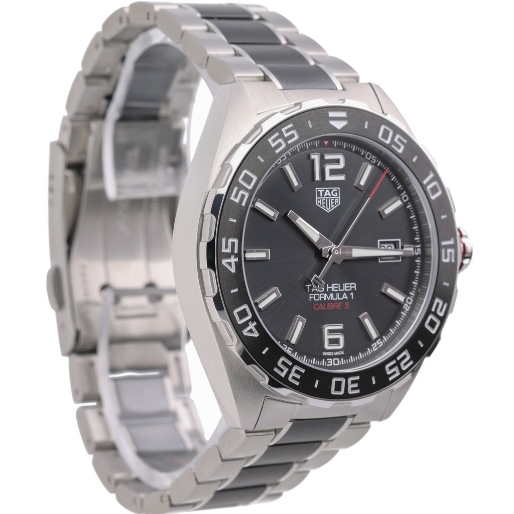 A Tag Heuer Formula 1 Calibre 5 watch crafted in stainless steel, featuring a sleek black bezel and a matching sunray-brushed black dial that exudes sportiness and precision. Model number WAZ2011.BA0843, this 2017 example is powered by Tag Heuer’s Calibre 5 automatic movement, renowned for its reliability and smooth performance. The 43mm case delivers a bold and contemporary presence, embodying the rugged yet refined character of the Formula 1 collection.