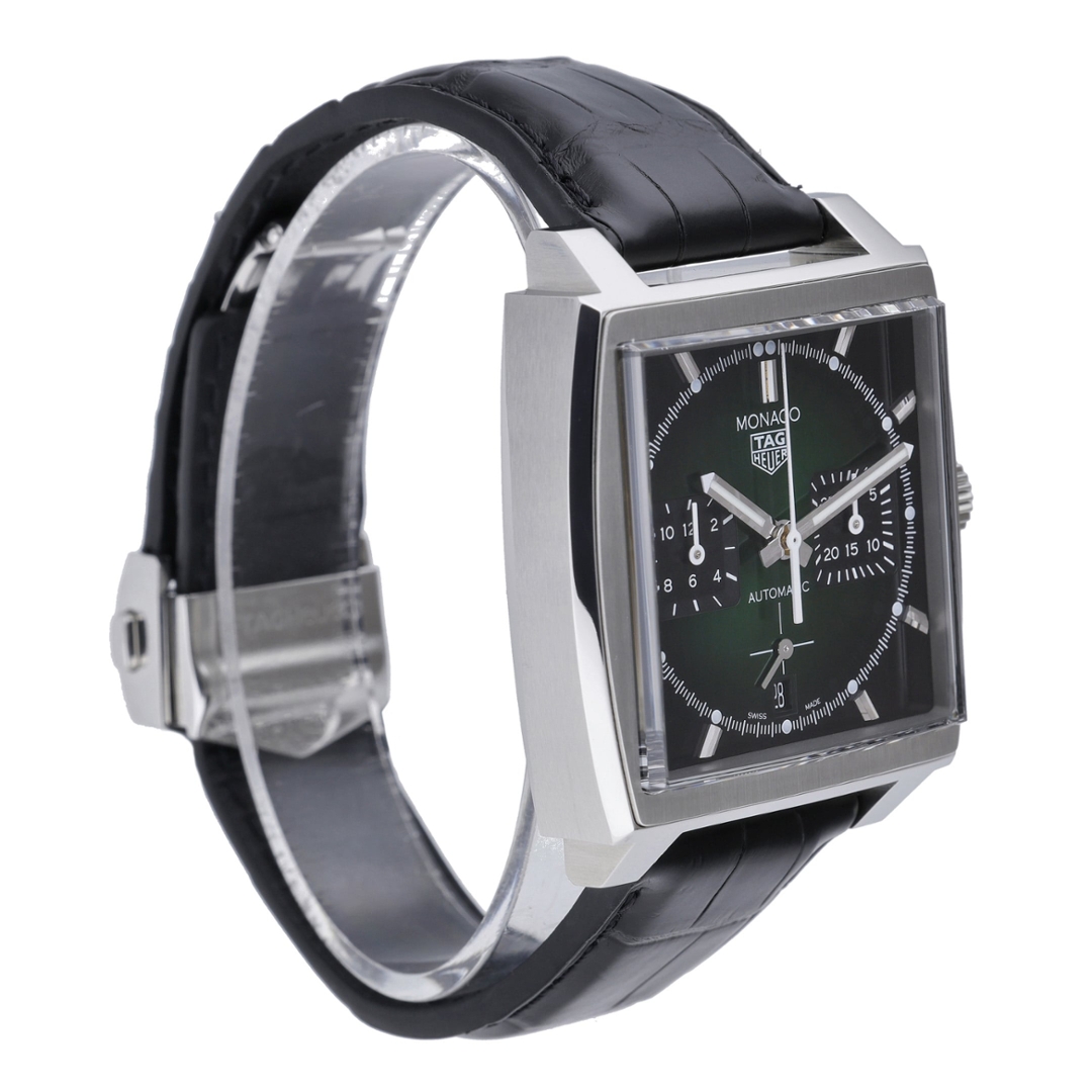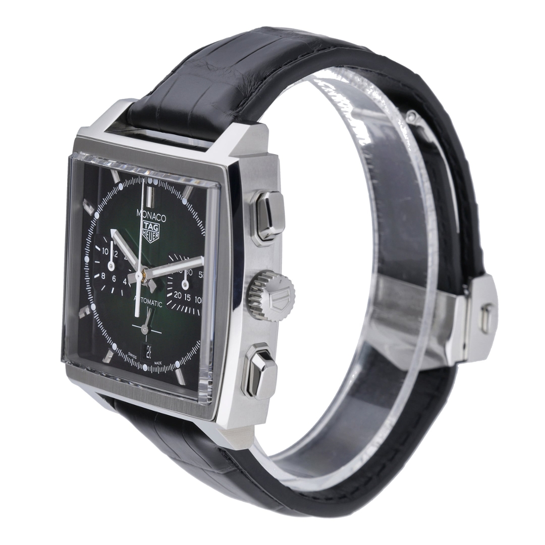 A TAG Heuer Monaco reference CL2116, an instantly recognisable square-cased chronograph that blends motorsport heritage with contemporary design. This 39mm stainless steel model is paired with a black leather strap and features a striking green sunburst dial, framed by angular chronograph sub-dials and bold applied hour markers. The left-hand crown and square pushers remain true to the Monaco’s unconventional and iconic design language.