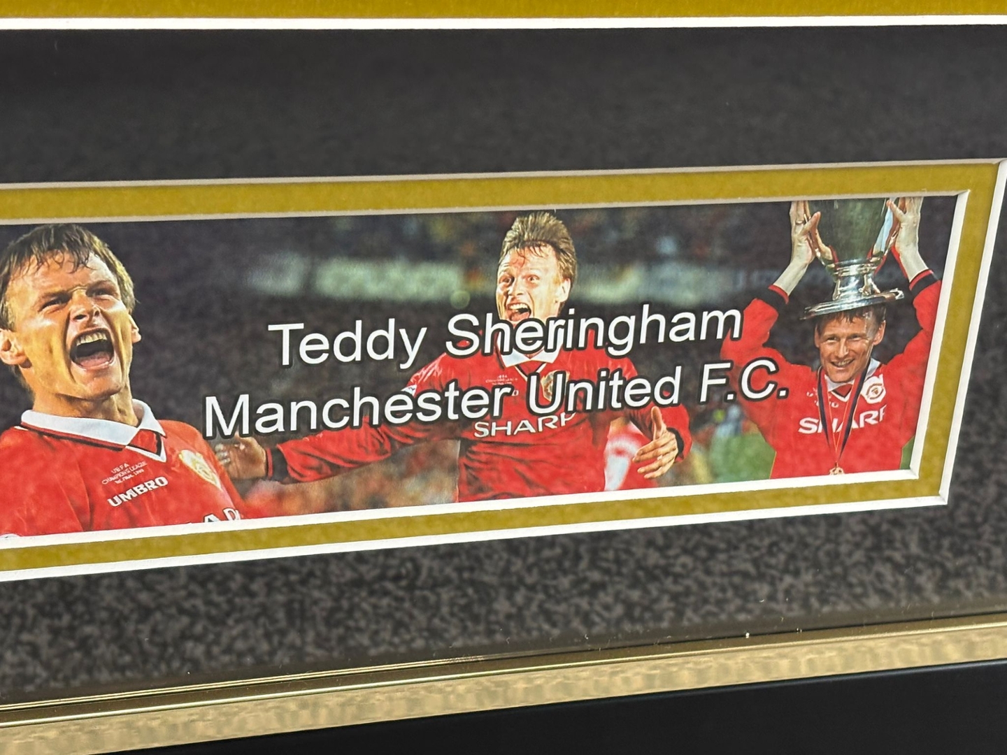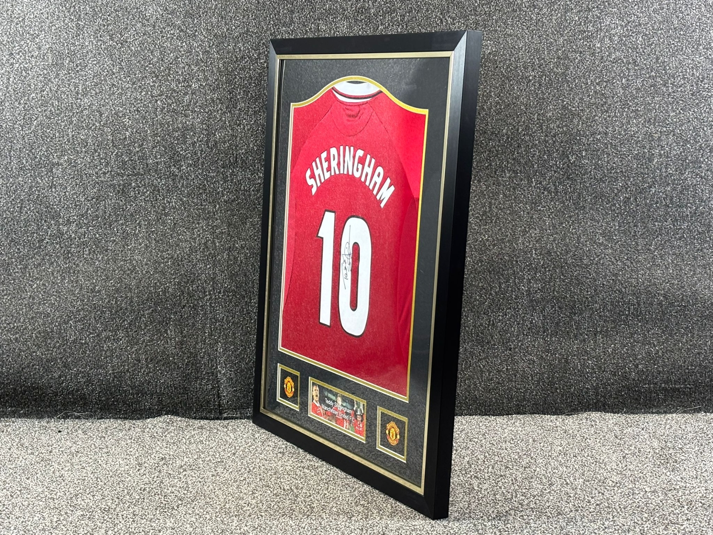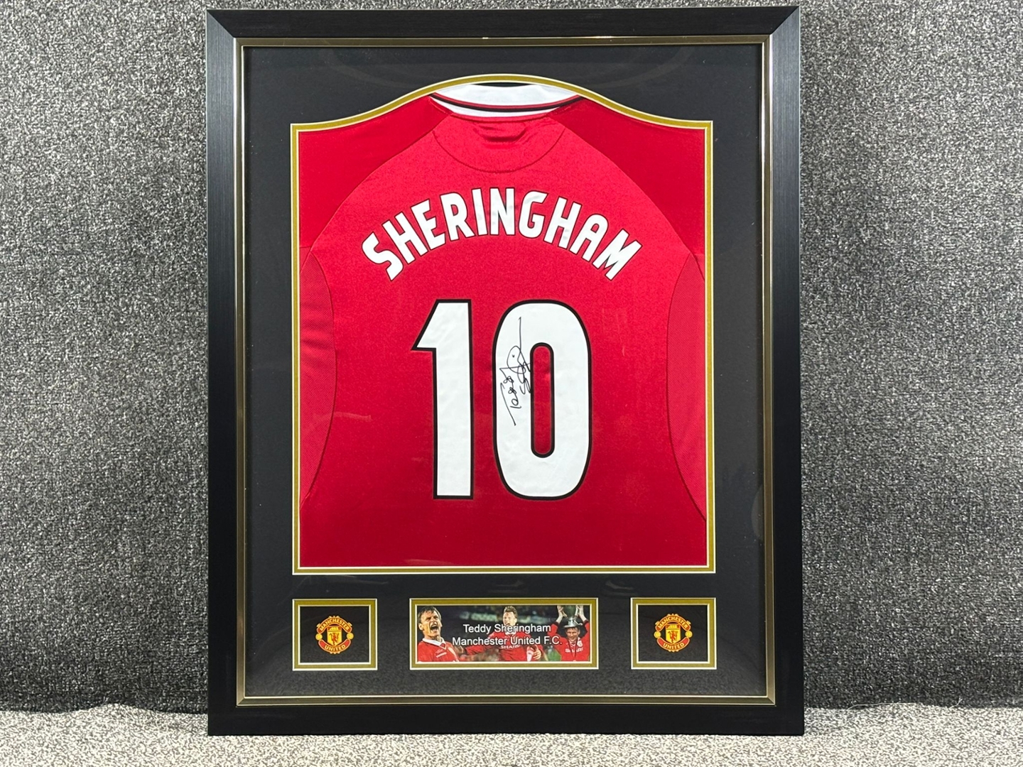 A signed and authenticated Teddy Sheringham Man United Football Shirt in a presentation frame. Approx 83cm height, 68cm width.
