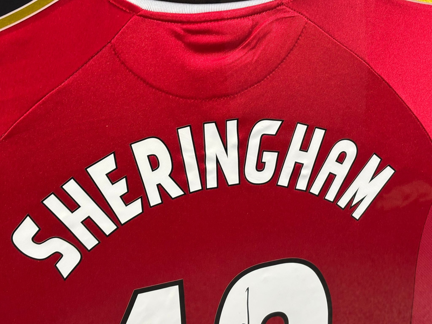 Beautifully presented in a high-quality frame, the shirt stands out with its striking Manchester United red, enhanced by the black and gold trim of the mount. The frame also includes official club crests and imagery of Sheringham in action, adding depth and authenticity to the display. Measuring approximately 83cm in height and 68cm in width, it makes an impressive statement piece for any wall.