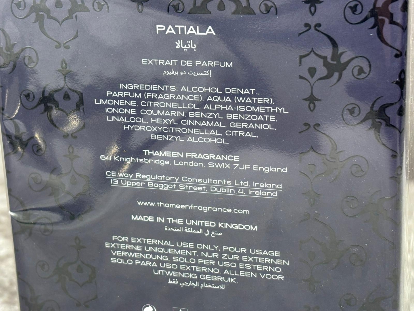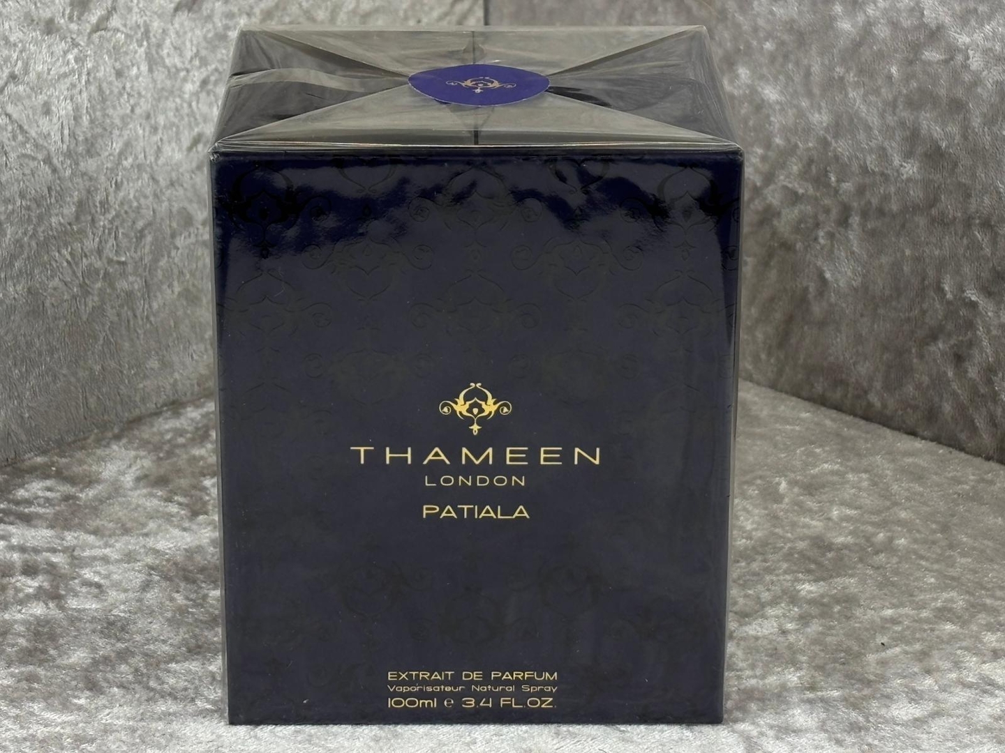 A 100ml bottle of Patiala Extrait De Parfum by Thameen, presented in its official presentation box. Inspired by the opulence of one of the world’s most magnificent jewels, this extrait delivers exceptional richness and depth, crafted for those who appreciate bold, statement-making fragrances.