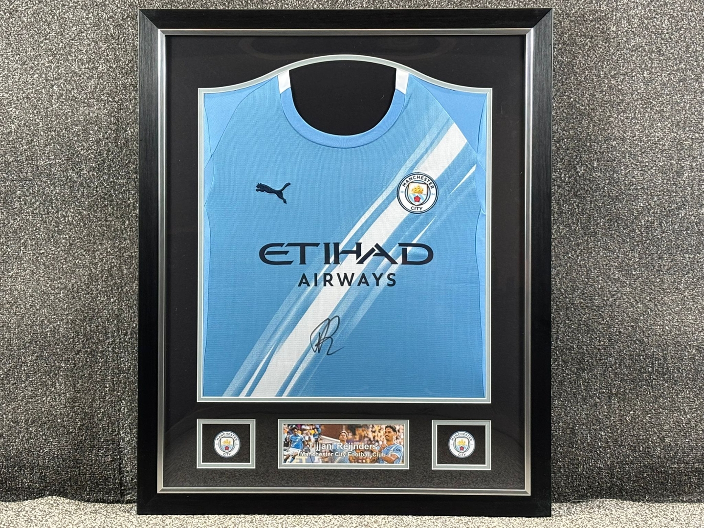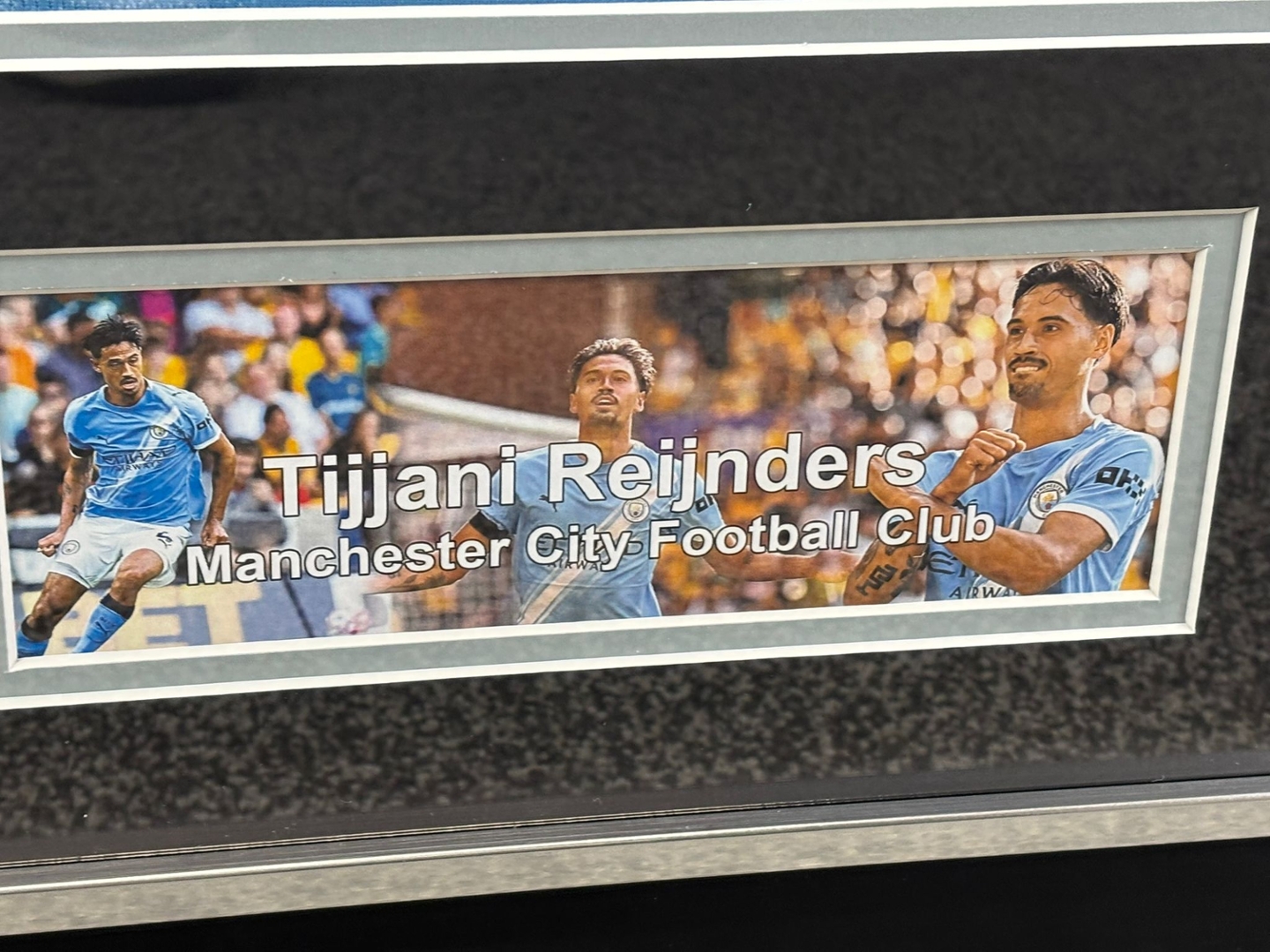 A signed and authenticated Tijjani Reijnders Man City Football Shirt in a presentation frame. Approx 83cm height, 68cm width.