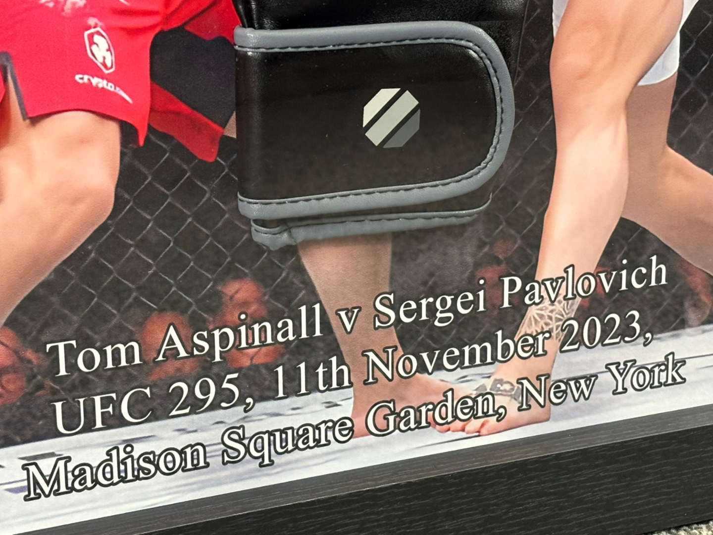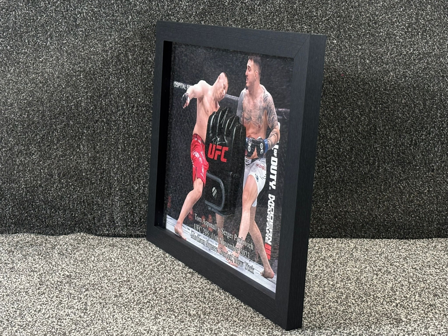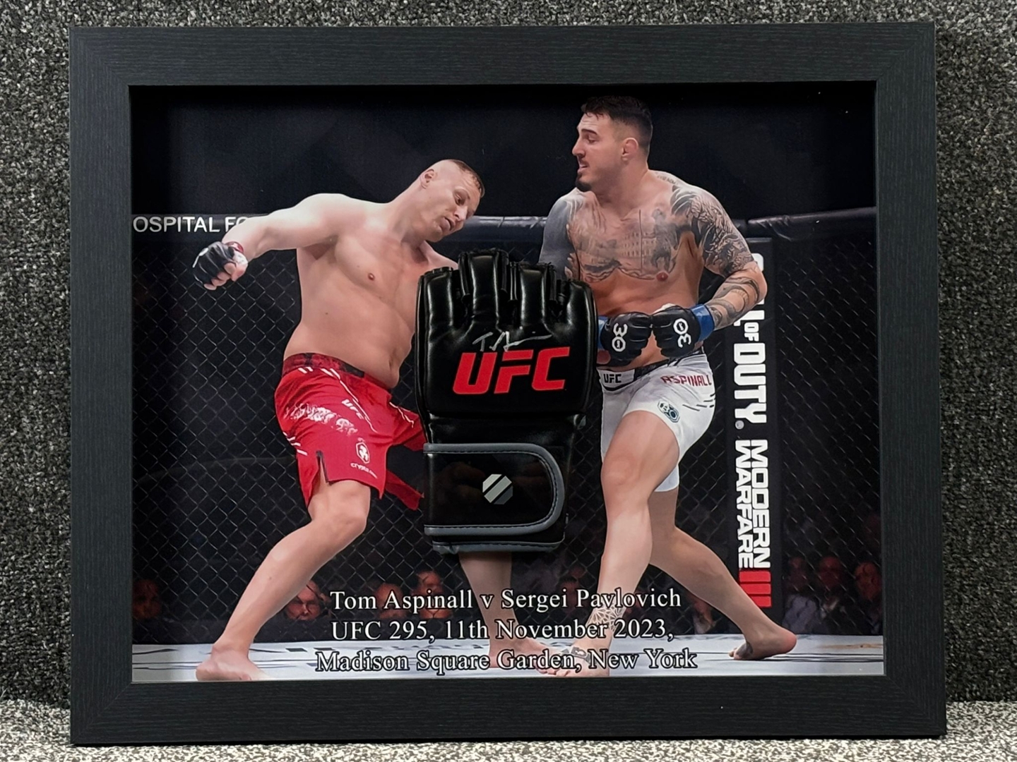 A signed and authenticated Tom Aspinall UFC glove, presented in a striking display frame that celebrates a defining moment in modern mixed martial arts. This collector’s piece commemorates Aspinall’s electrifying victory over Sergei Pavlovich at UFC 295 on 11th November 2023, held at the iconic Madison Square Garden in New York.