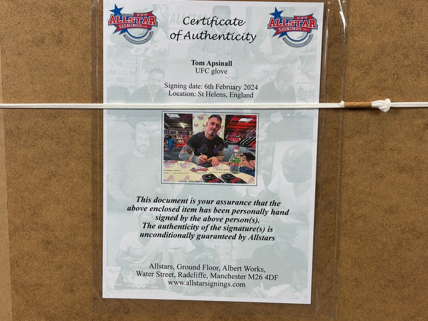 The display features the official UFC glove, personally signed by Aspinall, mounted against a dynamic action shot capturing the intensity of his championship-winning performance. The combination of imagery and inscription highlights both the power and precision that have made Aspinall one of the UFC’s most exciting heavyweights.