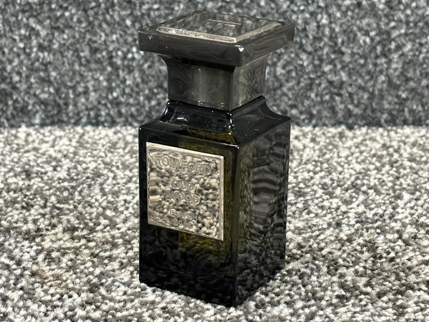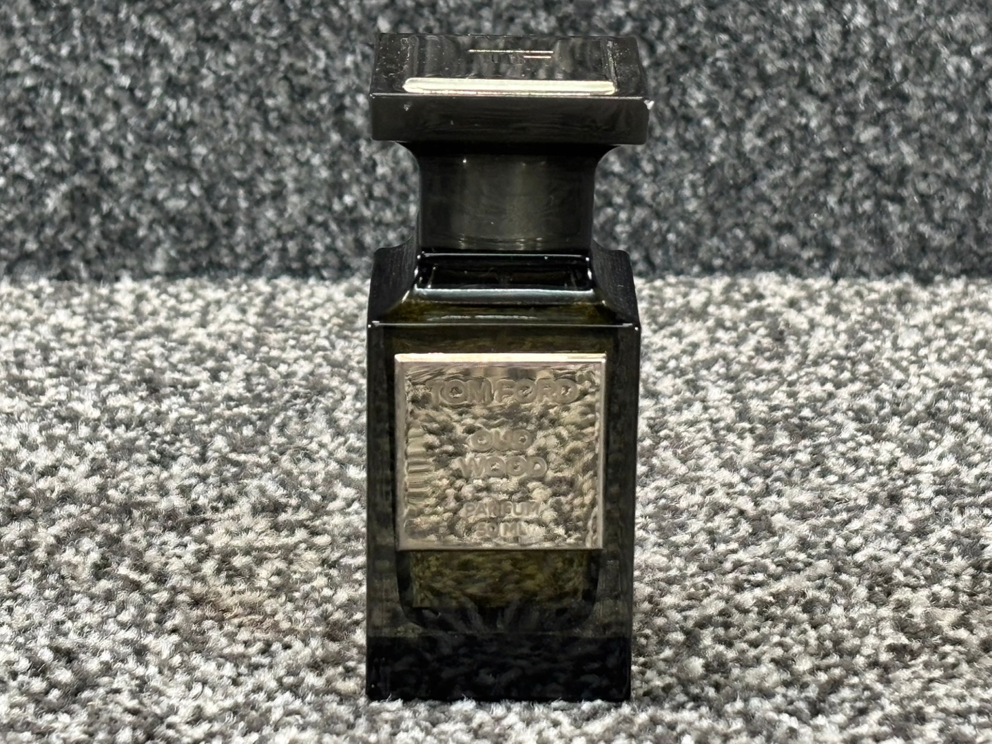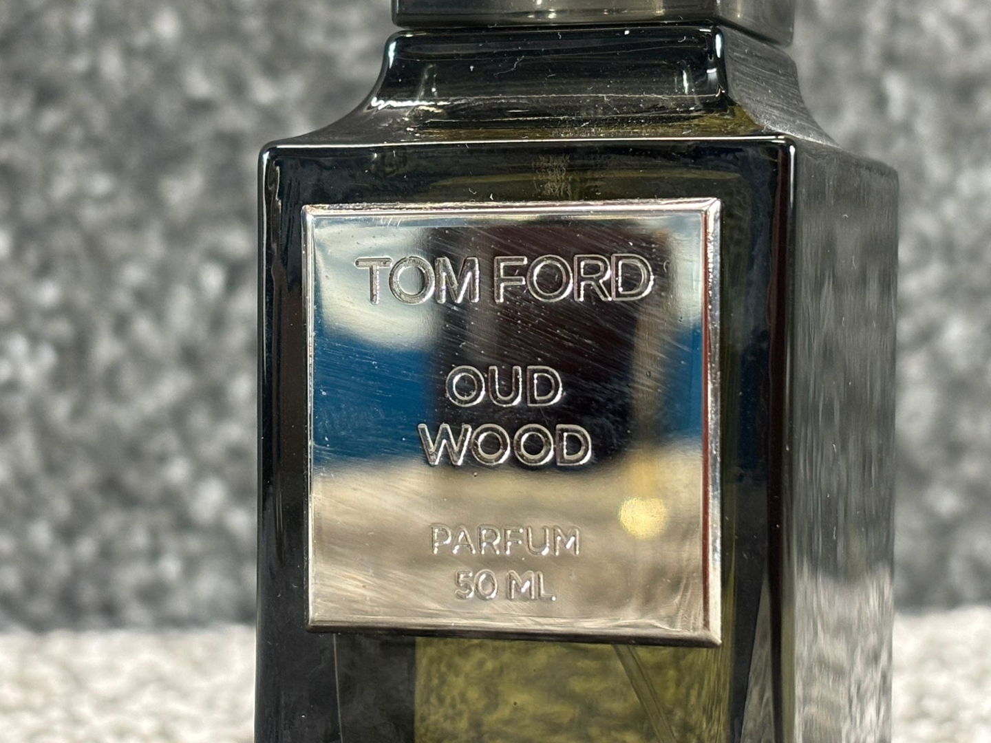 A 50ml bottle of Tom Ford Oud Wood Parfum, a refined and