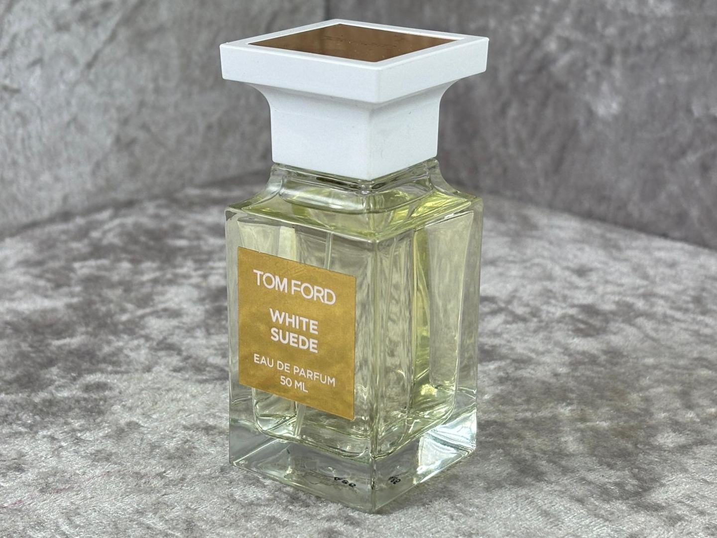 A 50ml bottle of White Suede Eau De Parfum by Tom Ford. This elegant Private Blend fragrance is renowned for its soft, refined character, combining delicate florals with smooth suede and warm undertones. Subtle yet captivating, it delivers a clean and sophisticated presence that feels effortlessly luxurious.