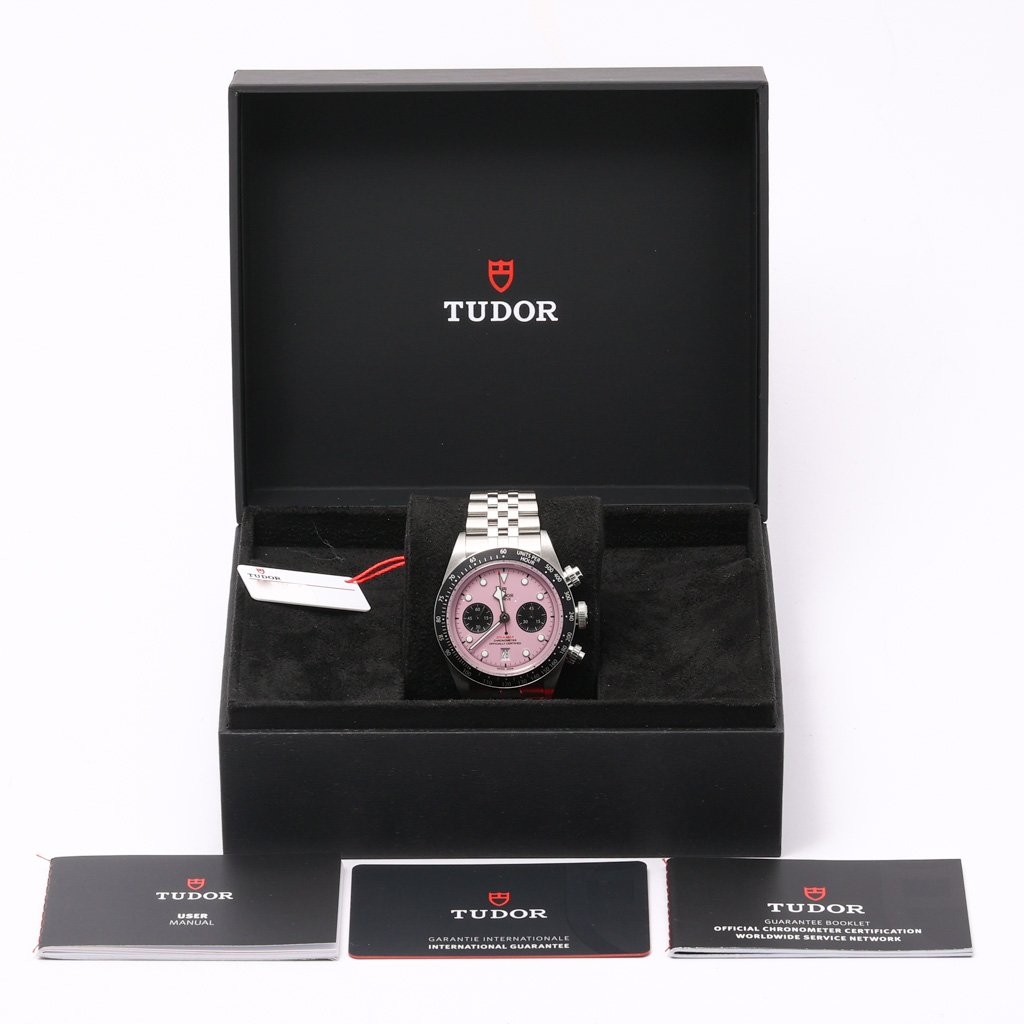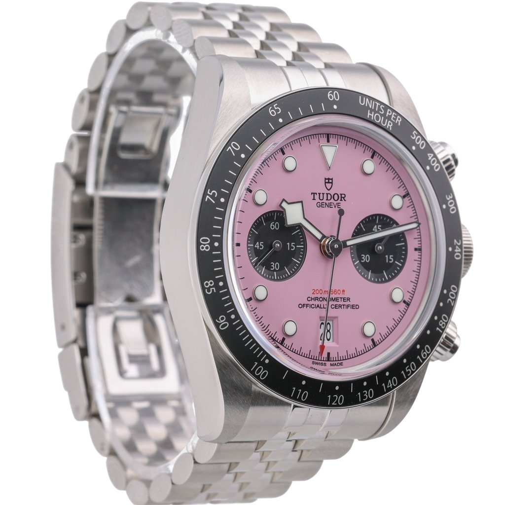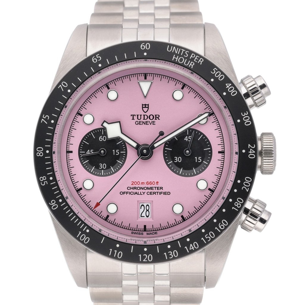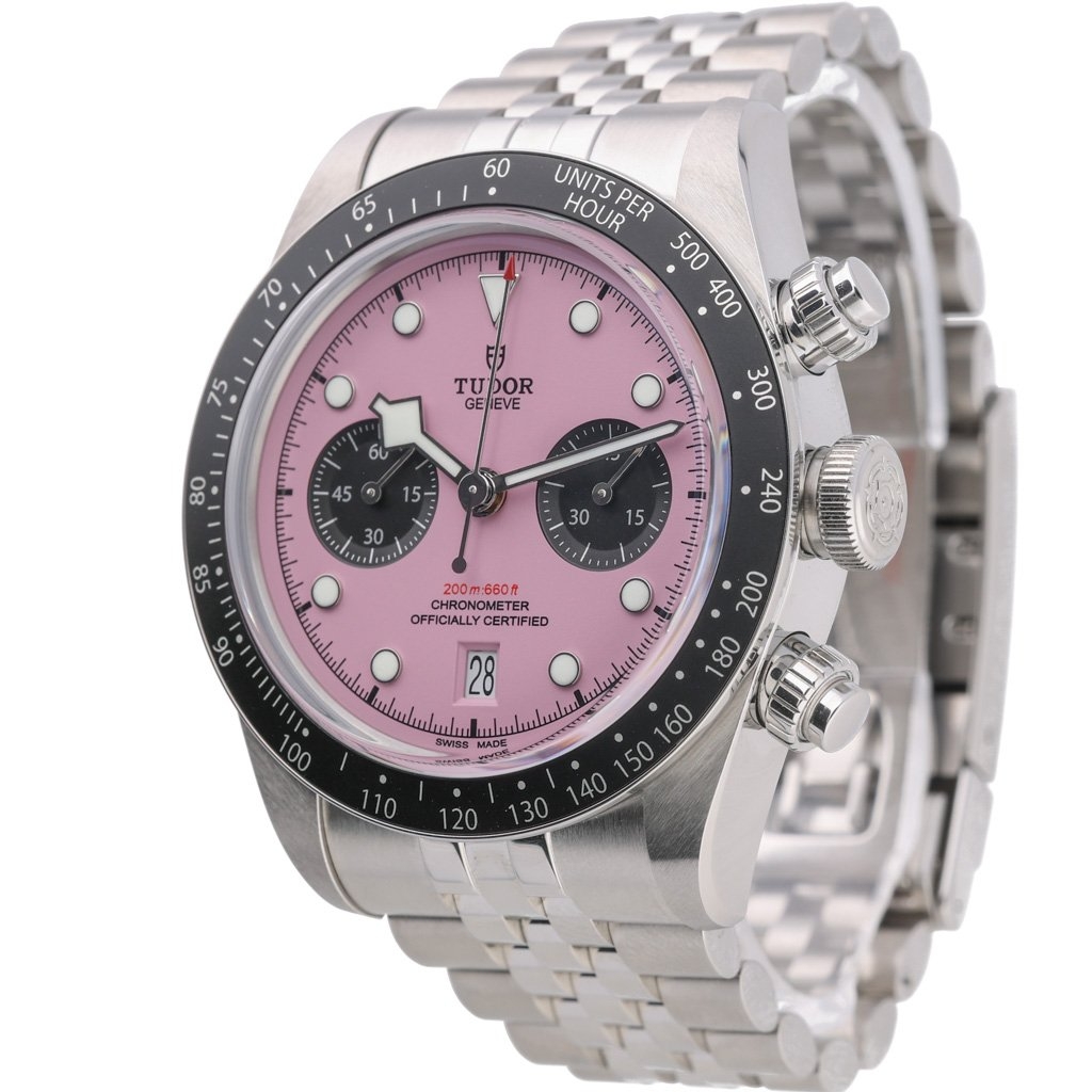A Tudor Black Bay Chrono Watch, Stainless Steel with a Black Bezel on a Pink Dial