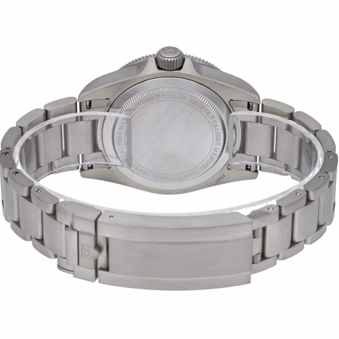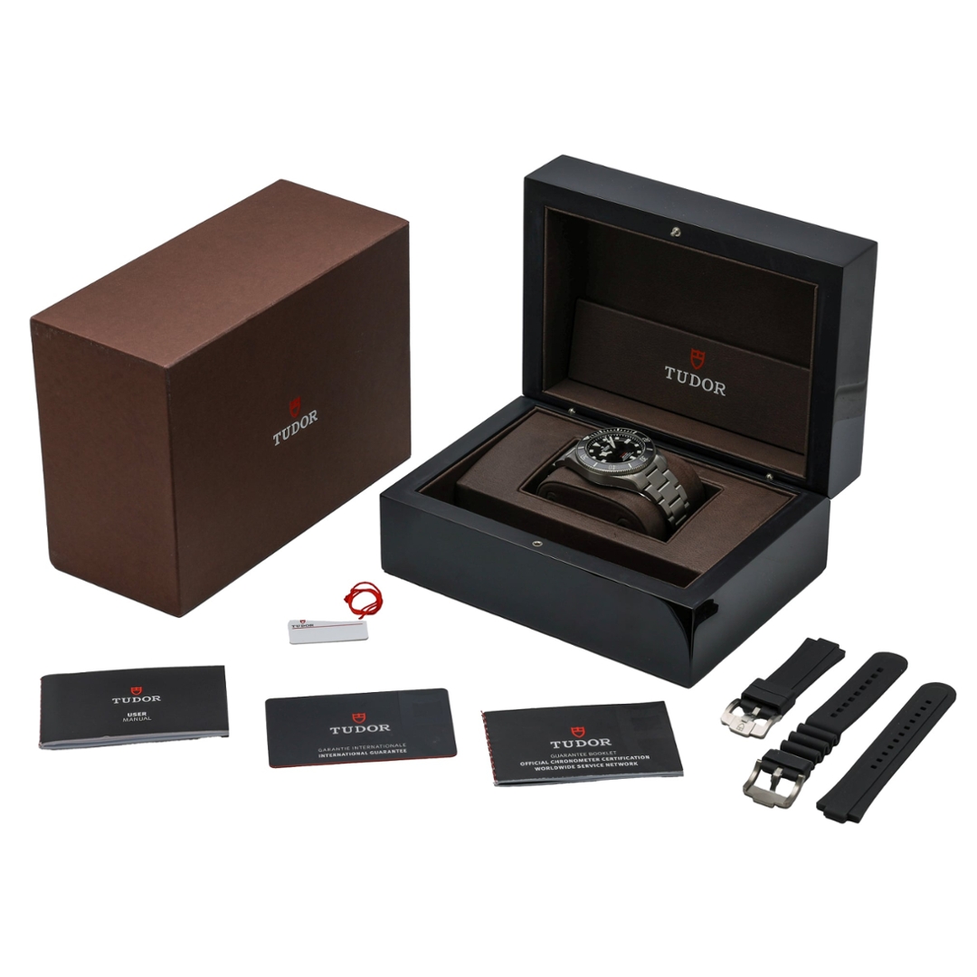 The matte black dial features luminous hour markers and Tudor’s distinctive snowflake hands, ensuring superb legibility in all lighting conditions. The unidirectional titanium bezel with a ceramic insert enhances the watch’s professional diving capabilities, while the satin finish on the case and bracelet provides a modern, tool-watch aesthetic that is both refined and functional.