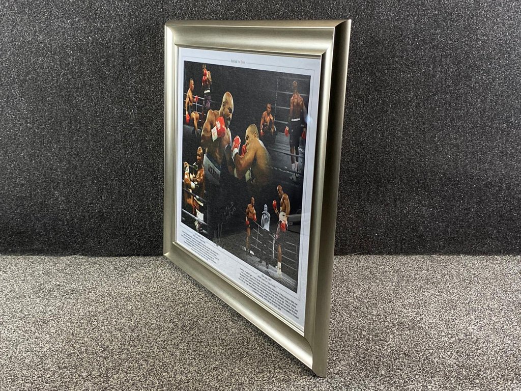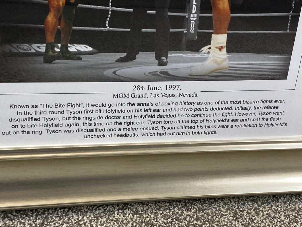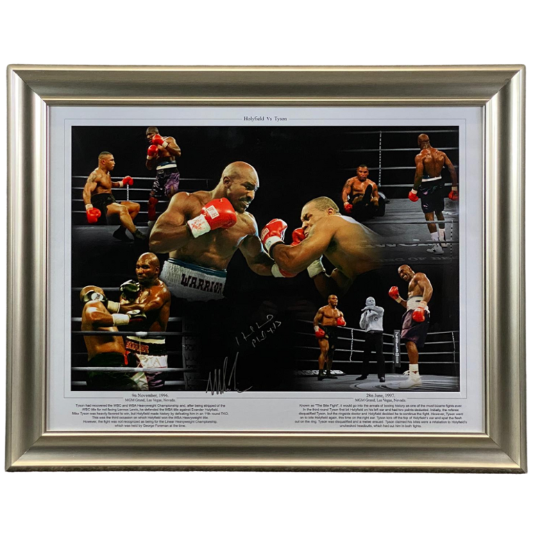 The presentation frame not only showcases the photograph and signatures but also enhances the overall aesthetic appeal, making it an eye-catching centrepiece for any sports memorabilia collection, home, or office decor. Whether displayed in a private collection or a public setting, this framed picture encapsulates the drama, excitement, and timeless legacy of the Tyson-Holyfield rivalry, ensuring its enduring appeal for generations to come.