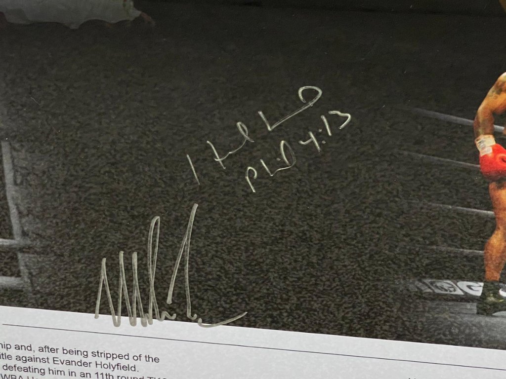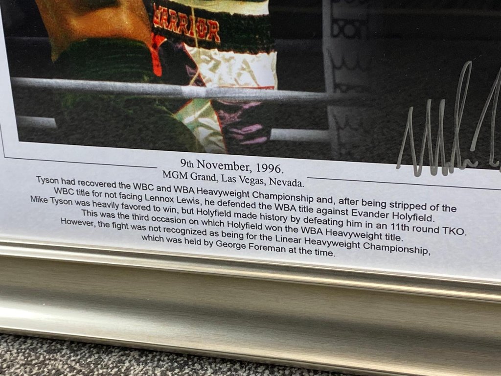 The photograph is accompanied by authentic signatures from Mike Tyson and Evander Holyfield, adding a layer of prestige and authenticity to the piece. These signatures serve as tangible reminders of the skill, determination, and sportsmanship displayed by both fighters throughout their careers.
