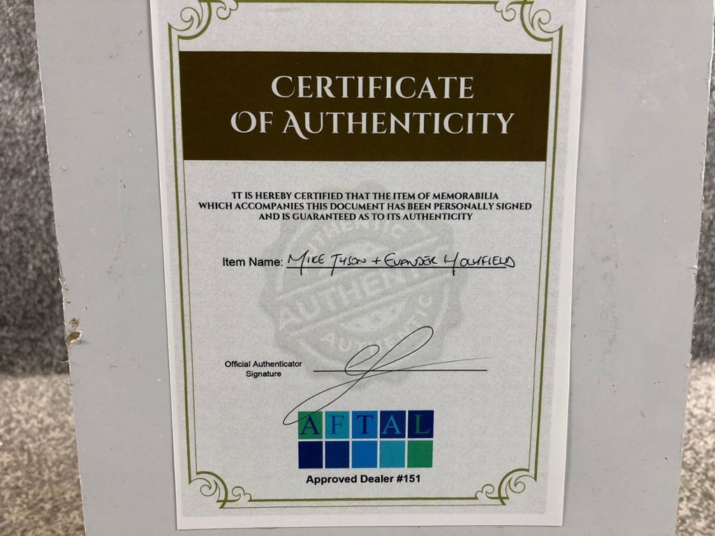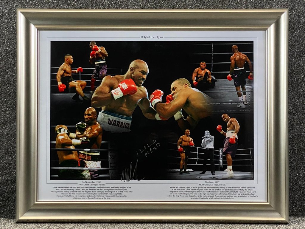 A signed & authenticated Mike Tyson & Evander Holyfield Boxing Picture in a presentation frame. Approx 30" height, 38" width.