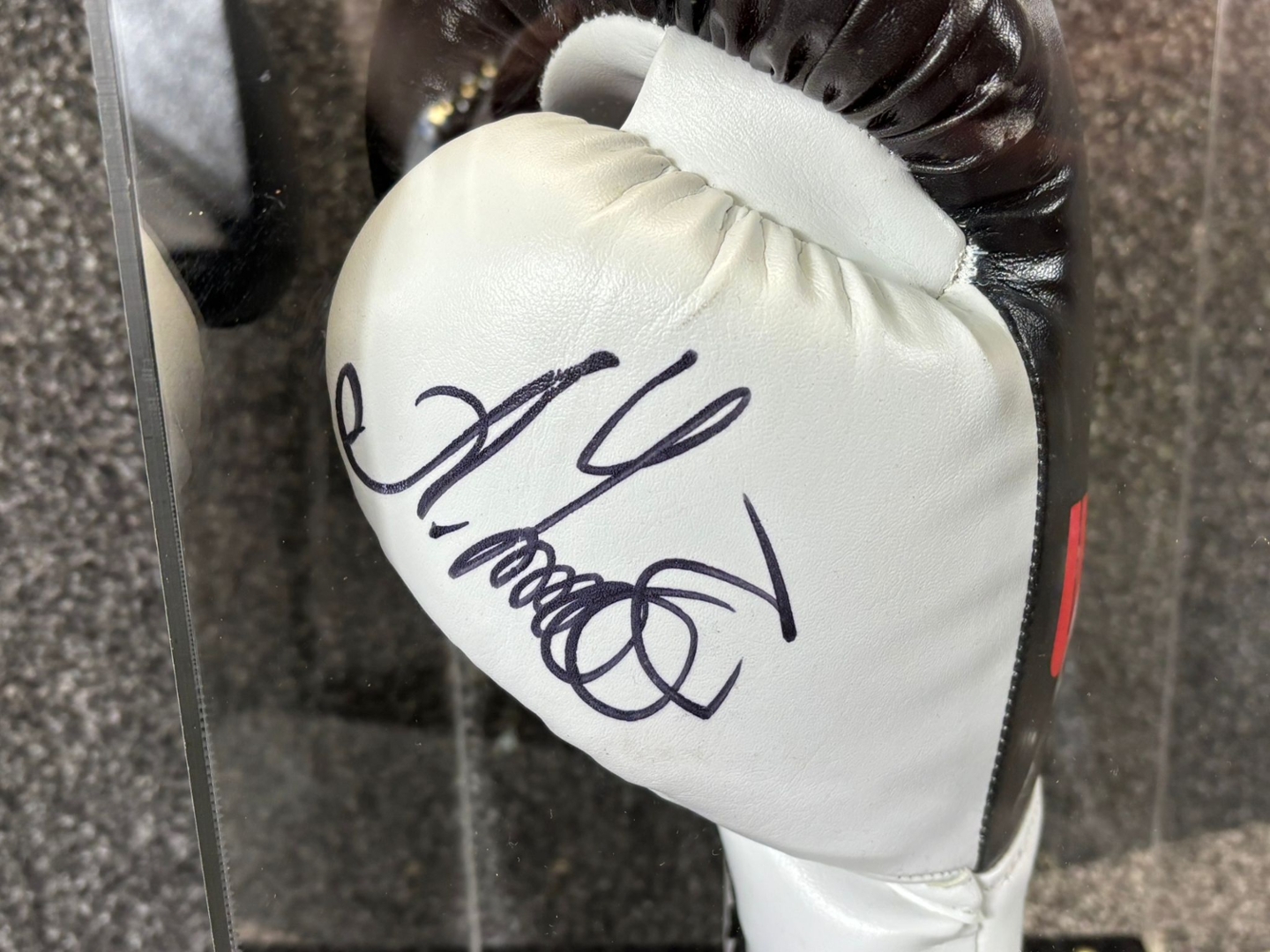 A signed and authenticated Tyson Fury and Oleksandr Usyk boxing glove from their highly anticipated second fight. This incredible collector’s item is beautifully displayed in a premium presentation case, capturing the intensity and significance of one of the most talked-about rematches in modern boxing.