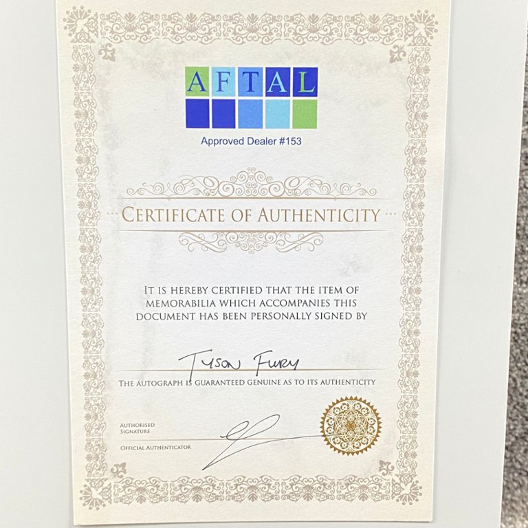 Tyson Fury's signature on the boxing glove adds a layer of authenticity and value, making it a prized possession for boxing enthusiasts and collectors alike. Authenticated to ensure its genuineness, this glove represents a tangible piece of Fury's remarkable career and achievements in the boxing world.
