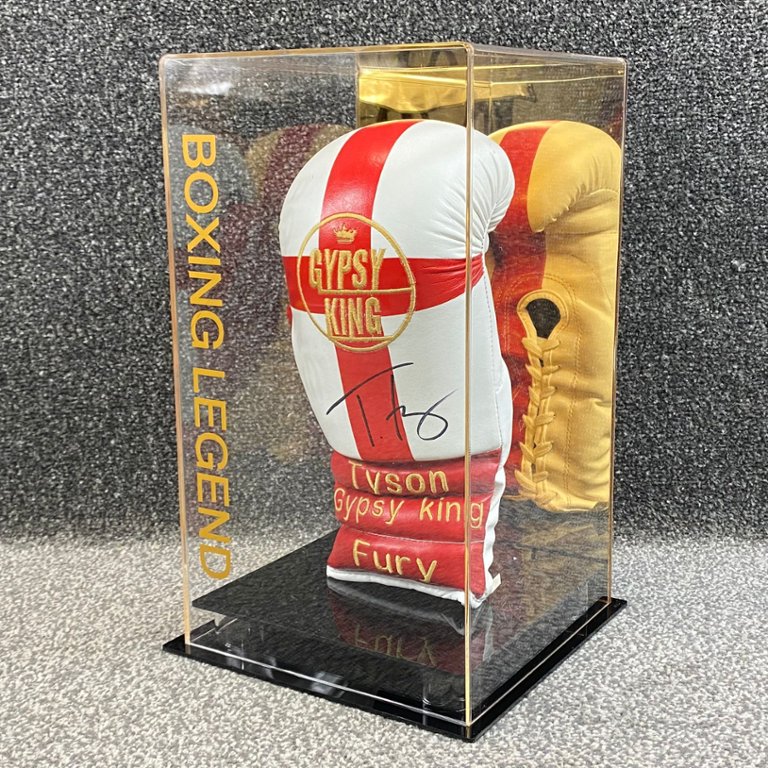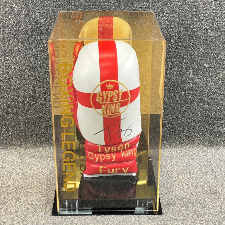 A signed & authenticated Tyson Fury St George Cross Boxing Glove in a presentation case. Approx 15" height, 9" width.
