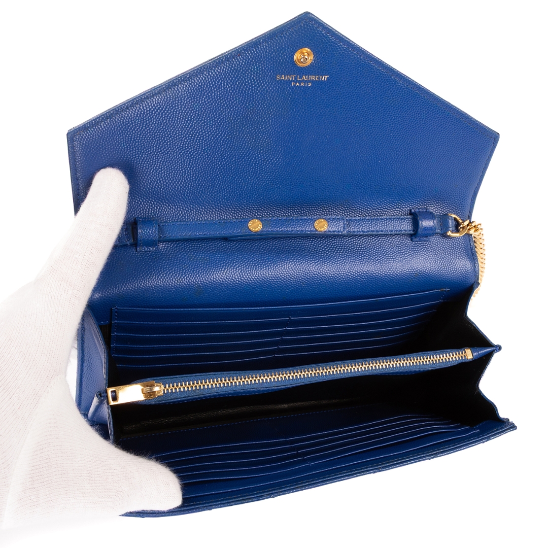 A vintage YSL blue calf leather Chain Wallet with a certificate of authenticity, Approximately 14cm height, 22cm width.