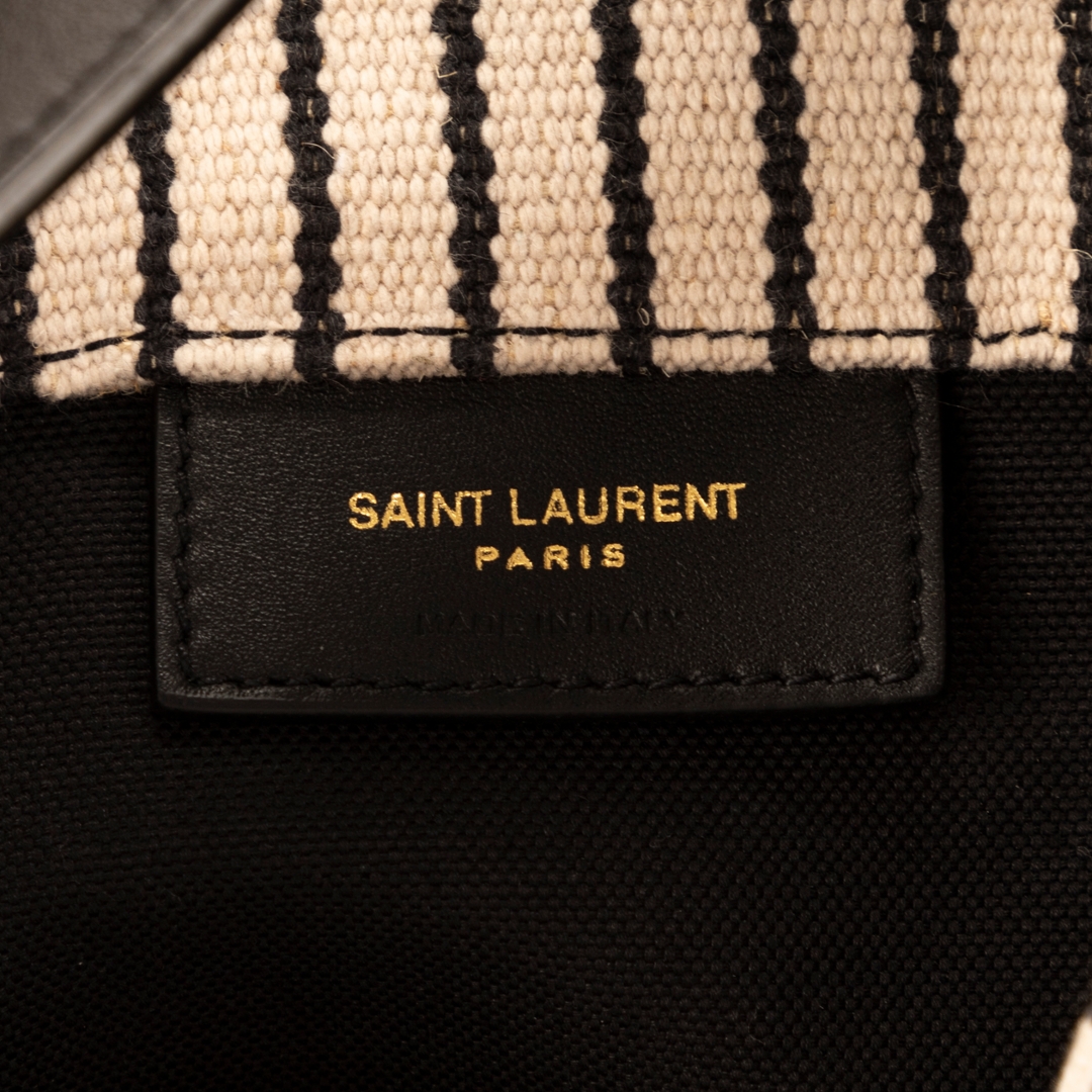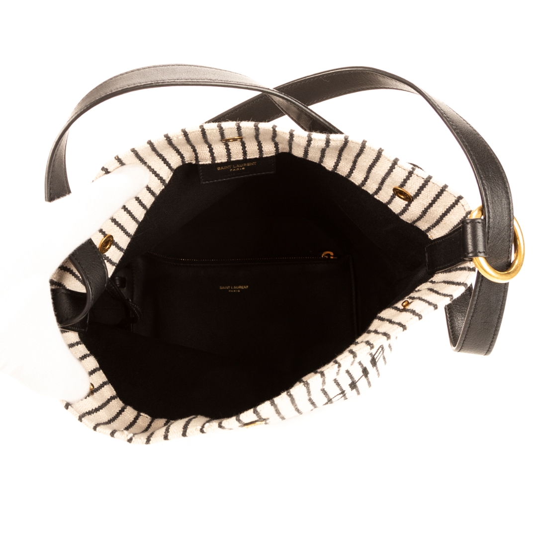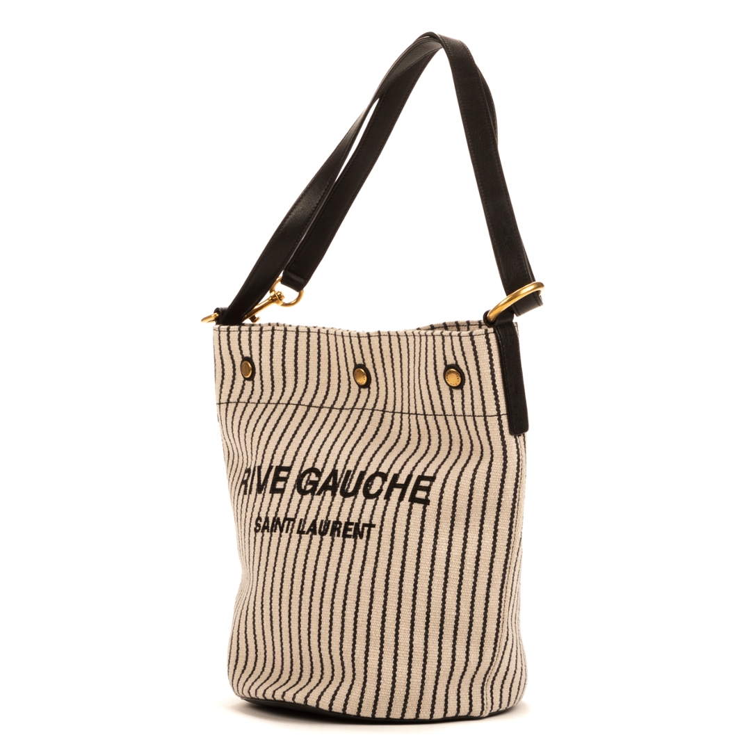 A new YSL beige canvas Rive Gauche Bucket bag that captures the effortless sophistication and modern edge synonymous with Saint Laurent. Crafted from durable beige canvas with sleek black leather trim, this striking design showcases the brand’s bold “Rive Gauche” logo embroidered across the front — a tribute to Yves Saint Laurent’s iconic Parisian heritage. The vertical stripe pattern enhances its contemporary aesthetic, while the structured yet relaxed silhouette makes it perfect for both city strolls and weekend getaways.