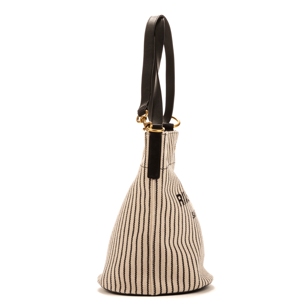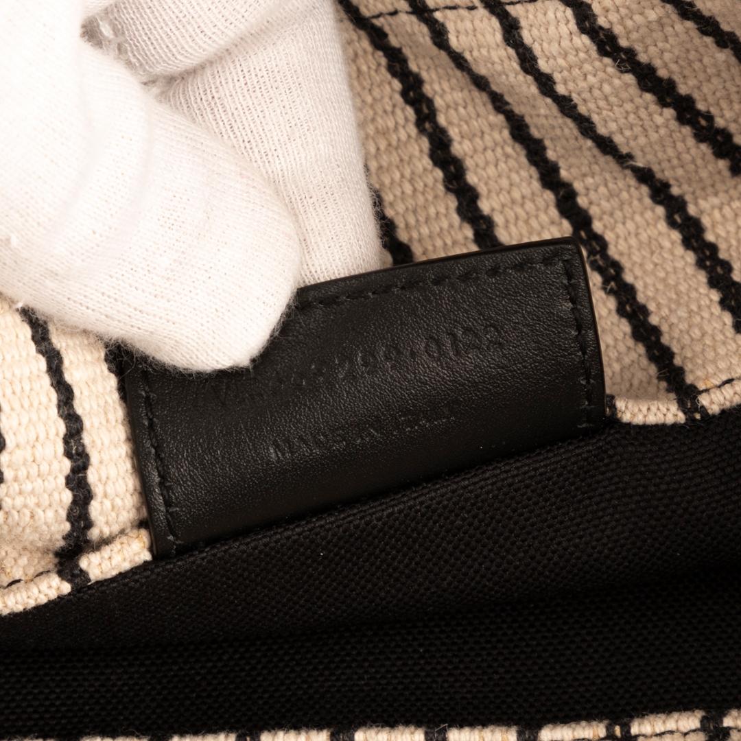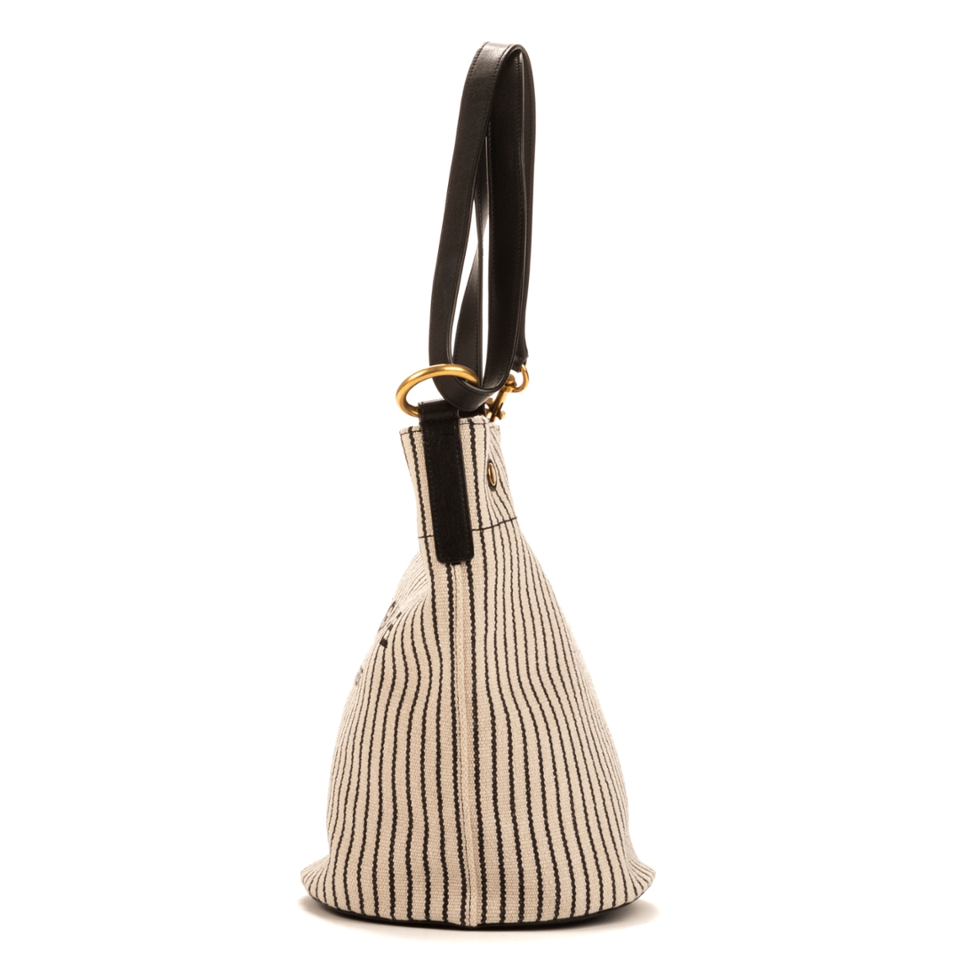 A new YSL beige canvas Rive Gauche Bucket bag that captures the effortless sophistication and modern edge synonymous with Saint Laurent. Crafted from durable beige canvas with sleek black leather trim, this striking design showcases the brand’s bold “Rive Gauche” logo embroidered across the front — a tribute to Yves Saint Laurent’s iconic Parisian heritage. The vertical stripe pattern enhances its contemporary aesthetic, while the structured yet relaxed silhouette makes it perfect for both city strolls and weekend getaways.
