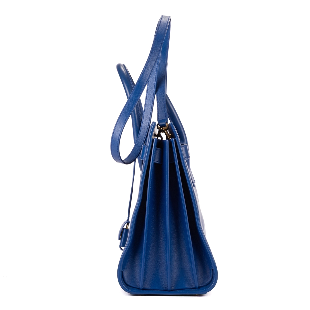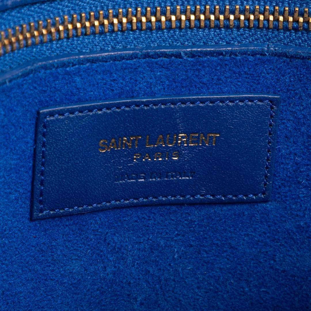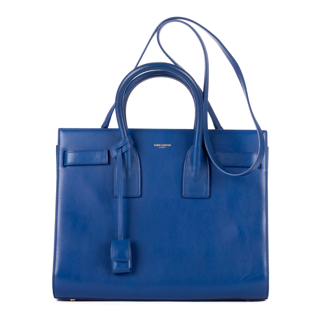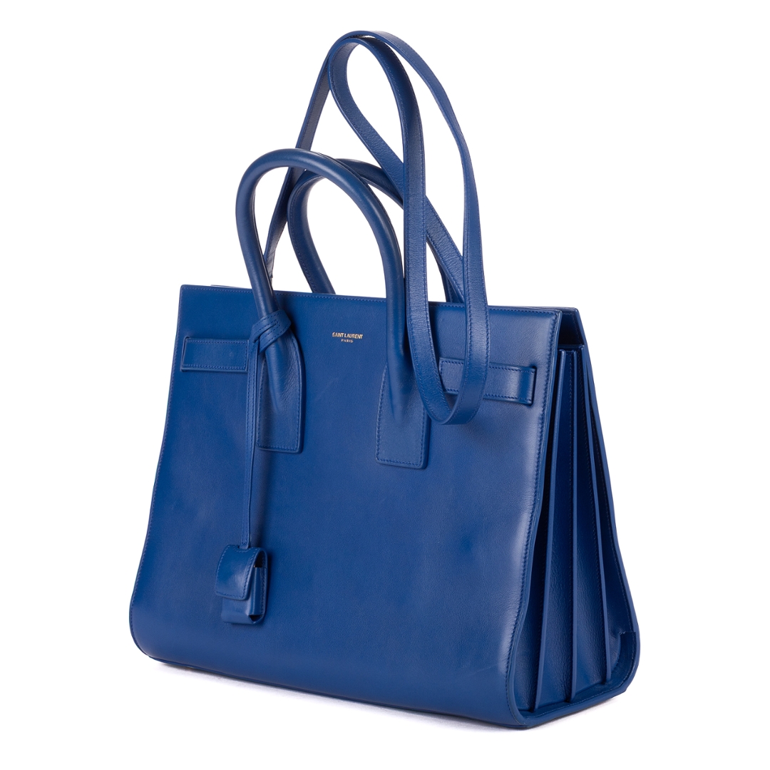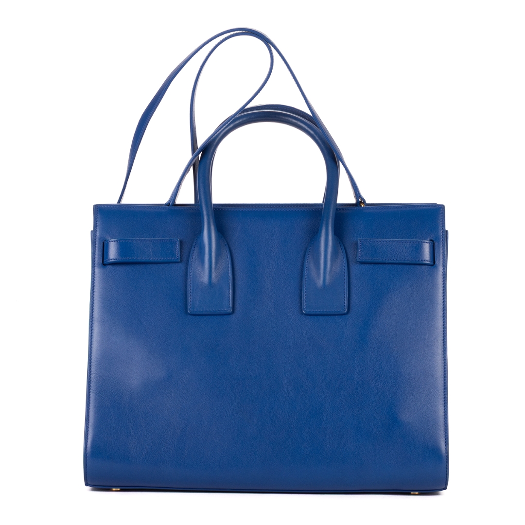 A vintage YSL blue calf leather Supple Sac De Jour bag with a certificate of authenticity, Approximately 24cm height, 31cm width.