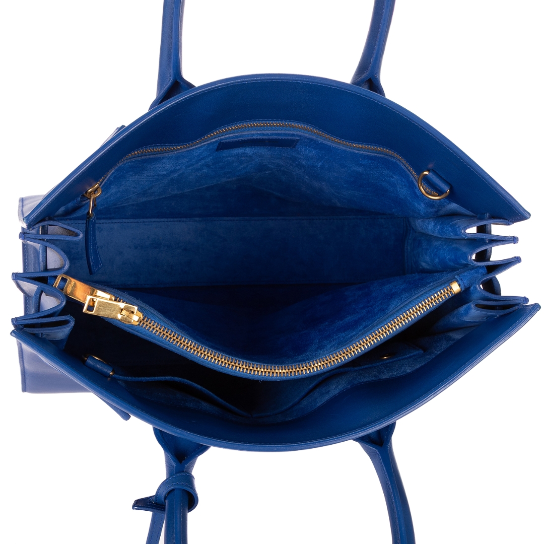 A vintage YSL blue calf leather Supple Sac De Jour bag that showcases Saint Laurent’s refined craftsmanship and timeless minimalism. This beautifully structured tote is crafted from luxurious smooth calf leather in a rich, striking blue tone — a colour that perfectly balances sophistication with bold, modern style. Designed with clean architectural lines, it captures the house’s effortless Parisian aesthetic, offering a flawless blend of elegance and functionality.