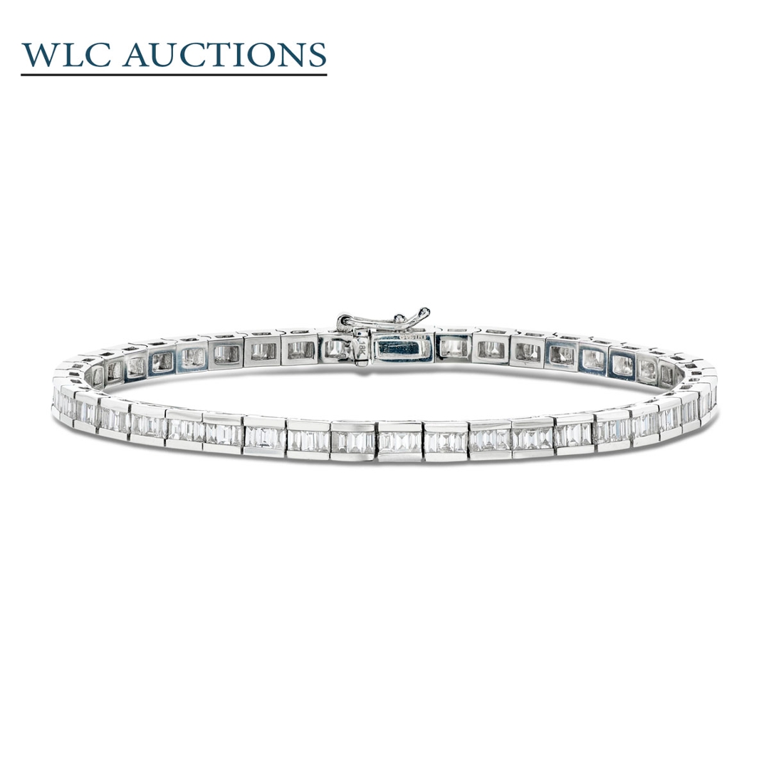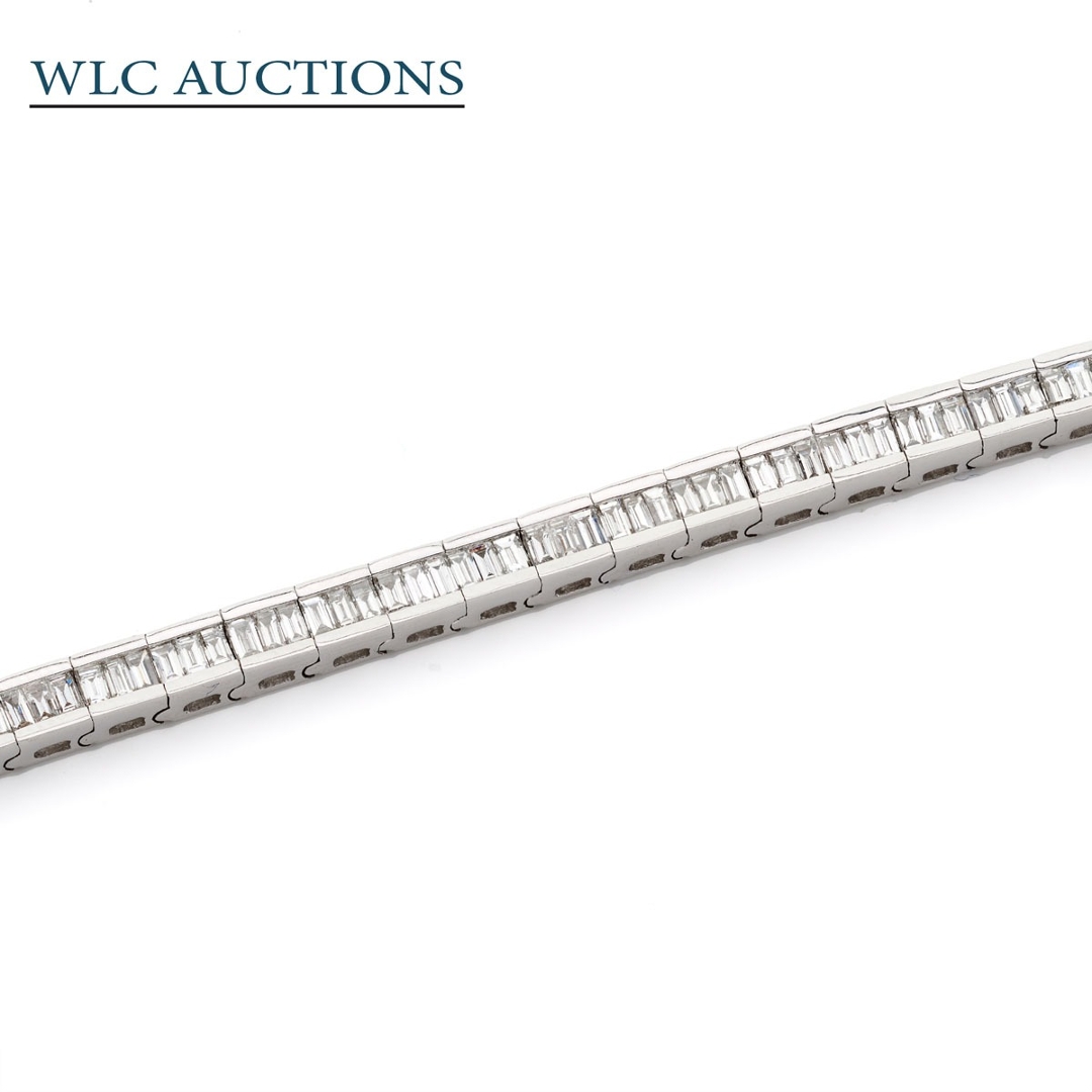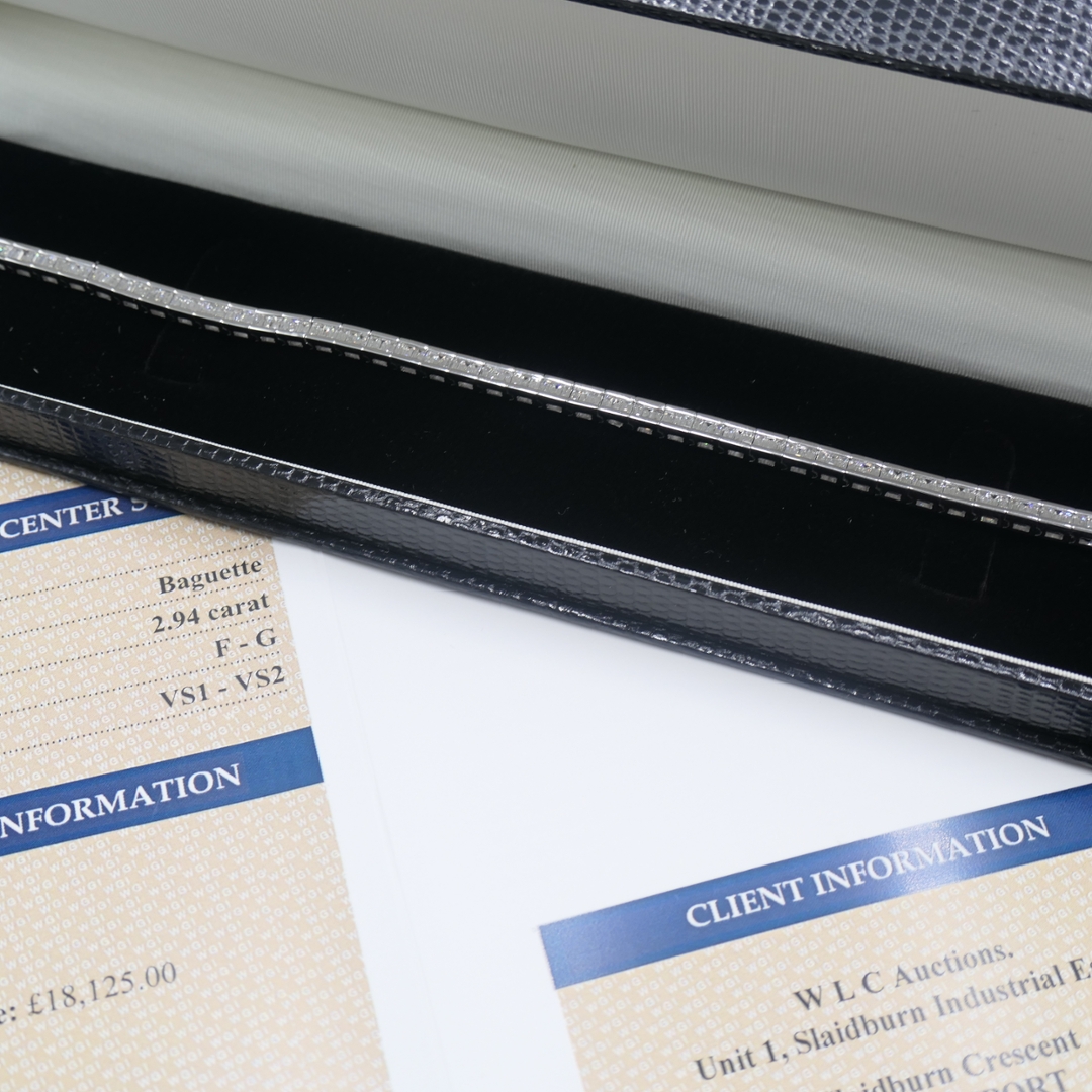 A brand-new, unused, certified 18ct white gold bracelet showcasing a refined cluster of baguette-cut diamonds, meticulously arranged to create a sleek and continuous brilliance. This exceptional bracelet features 2.94ct of natural diamonds, graded F–G for colour and VS1–VS2 for clarity, ensuring each stone radiates with a crisp white fire and remarkable transparency. The precision of the baguette cut enhances the bracelet’s geometric elegance, resulting in a modern yet timeless piece.