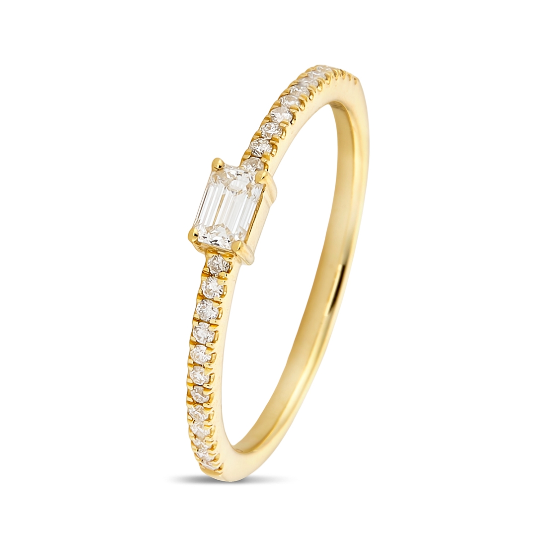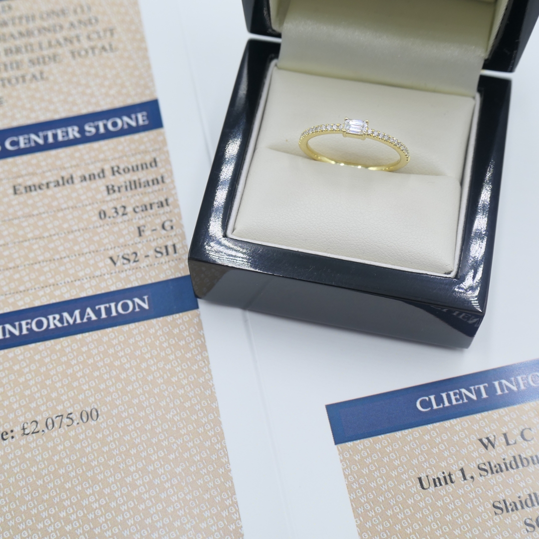 A brand-new, unused certified 18ct yellow gold natural diamond cluster ring, showcasing an elegant emerald-cut diamond at the centre, enhanced by a cluster of round brilliant-cut diamonds set along the band. With a total diamond weight of 0.32ct, the stones are graded F–G in colour and VS2–SI1 in clarity, ensuring an exceptional combination of brilliance, purity, and fire. The clean lines of the emerald cut are perfectly balanced by the radiant sparkle of the surrounding round cuts, creating a design that is both modern and timeless.