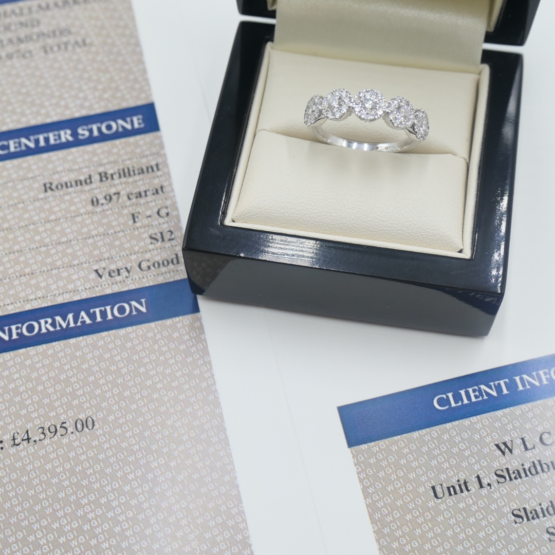 A brand-new, unused certified natural diamond cluster ring that radiates timeless elegance and captivating brilliance. This exquisite design features a beautifully arranged cluster of brilliant-cut natural diamonds, together weighing 0.97 carats. Graded F–G in colour and SI2 in clarity, each diamond has been carefully selected for its exceptional sparkle and purity. The cluster formation maximises light reflection, creating a dazzling display of fire and luminosity that highlights the natural beauty and sophistication of genuine diamonds. Every facet catches the light with breathtaking precision, offering a classic yet contemporary allure.