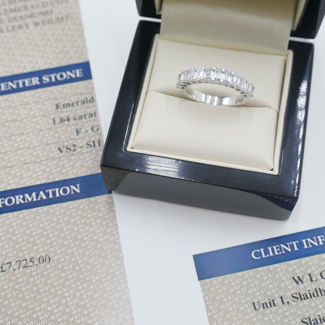 A brand-new, unused certified natural diamond cluster ring that exudes sophistication and timeless brilliance. Expertly crafted in luxurious platinum, this exquisite piece features a stunning cluster of emerald-cut diamonds totalling 1.64 carats. The sleek, angular facets of emerald cuts create a mesmerising hall-of-mirrors effect, offering a refined, elegant sparkle distinct from that of any other diamond shape. Graded F–G in colour and VS2–SI1 in clarity, the diamonds display exceptional purity and radiance, perfectly complemented by the cool, lustrous sheen of the platinum setting. Weighing 5.85 grams, the ring feels substantial and luxurious, embodying the enduring quality of fine craftsmanship.