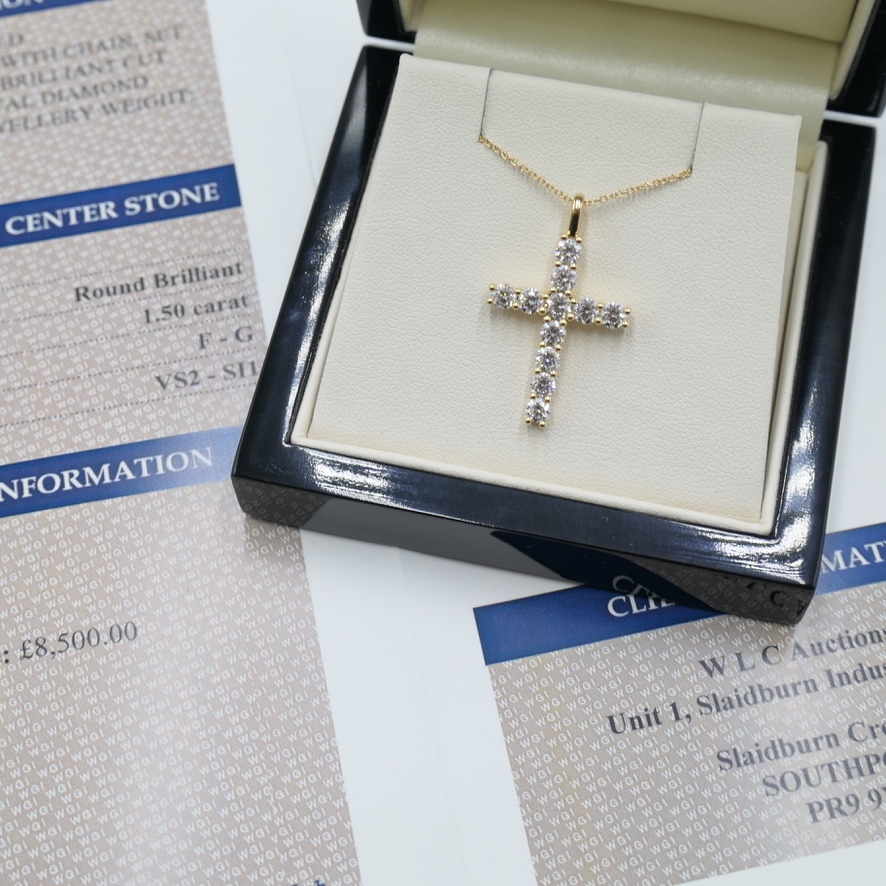A brand-new, unused, certified 18ct yellow gold natural diamond cross pendant that exudes elegance, meaning, and luxury in equal measure. Expertly set with a striking cluster of brilliant-cut natural diamonds, this exceptional piece totals 1.50 carats. With clarity graded between VS2 and SI1 and a bright F–G colour, each diamond has been hand-selected for its superior sparkle, clarity, and brilliance.
