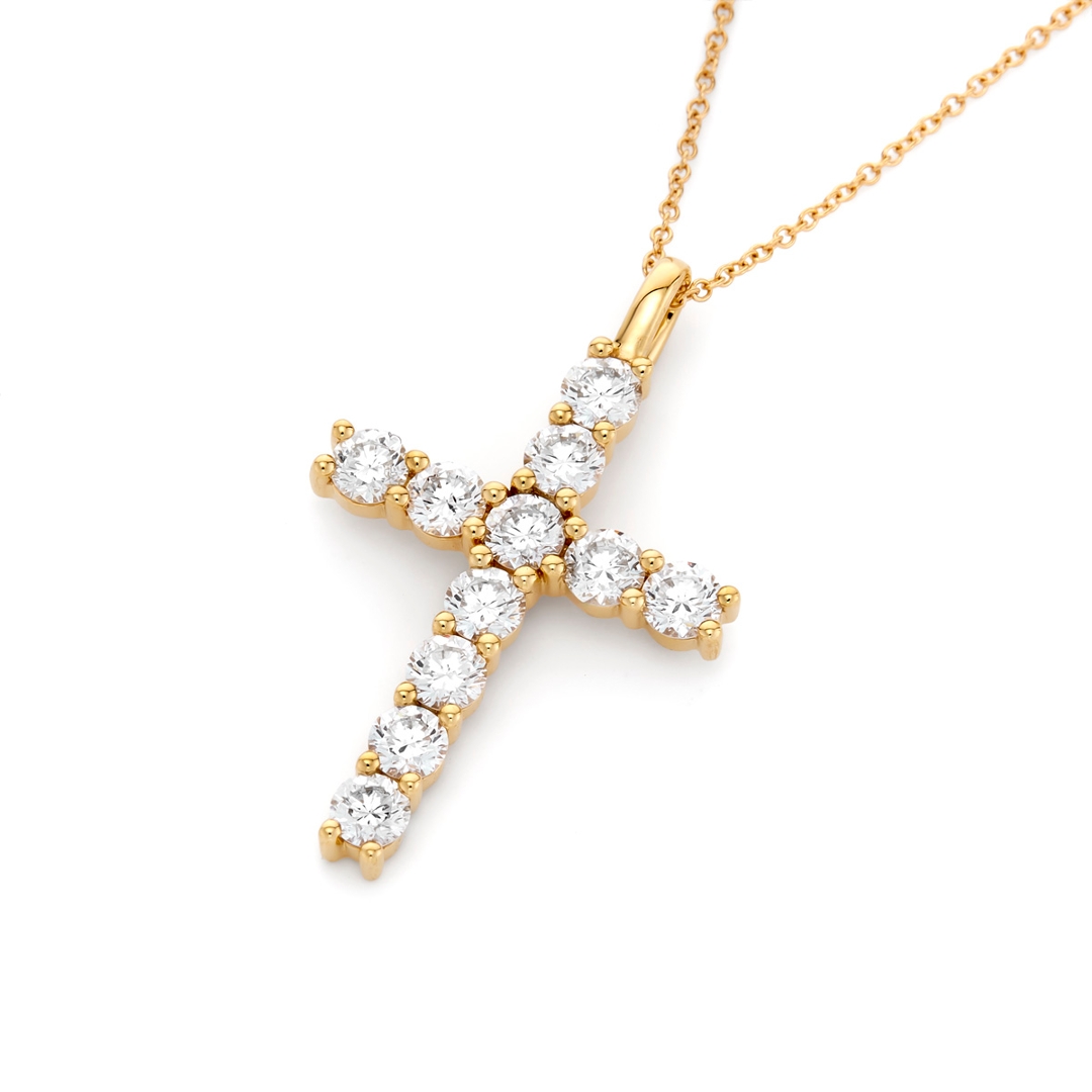 Crafted in rich 18ct yellow gold, weighing 4.09 grams, the warm, lustrous setting provides the perfect contrast to the radiant diamonds, creating a visually stunning piece that is both classic and contemporary. The iconic cross design offers deep personal symbolism, while the overall craftsmanship and diamond quality ensure it stands out as a piece of high-end fine jewellery.