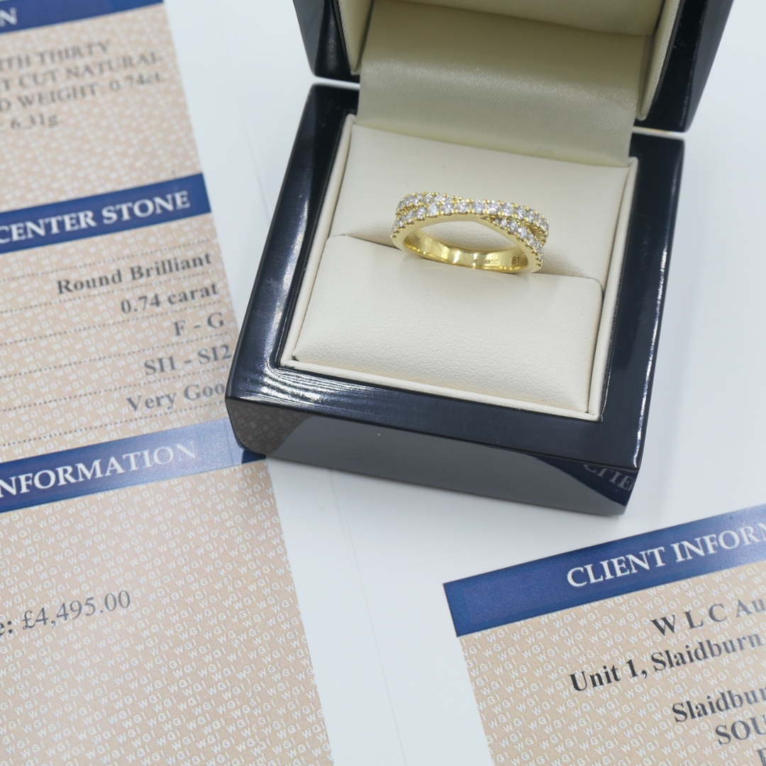 A brand-new, unused 18ct yellow gold natural diamond crossover cluster ring, beautifully crafted and set with a sparkling arrangement of round brilliant-cut diamonds. This striking design features thirty-three natural stones, totalling 0.74 carat, with an attractive F–G colour grade and clarity between SI1 and SI2. The diamonds are arranged across the crossover setting to maximise brilliance. At the same time, the rich yellow gold mount adds warmth and classic elegance, making this ring a versatile piece suited to both daily wear and special occasions. The total jewellery weight of 6.31g gives it a substantial and luxurious feel.