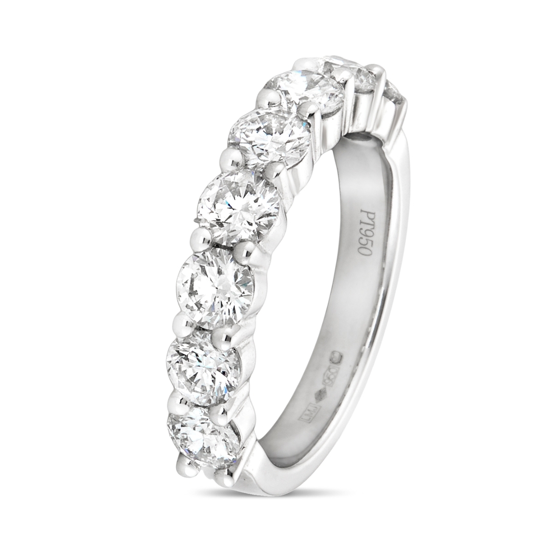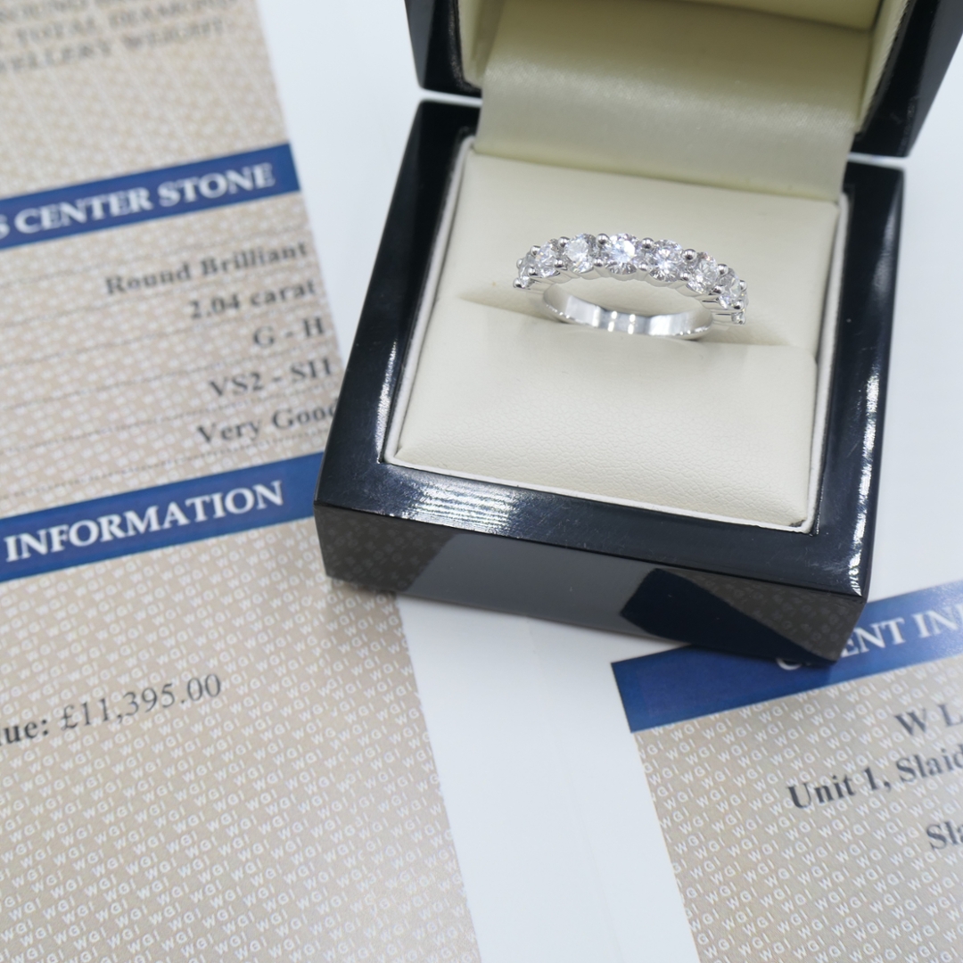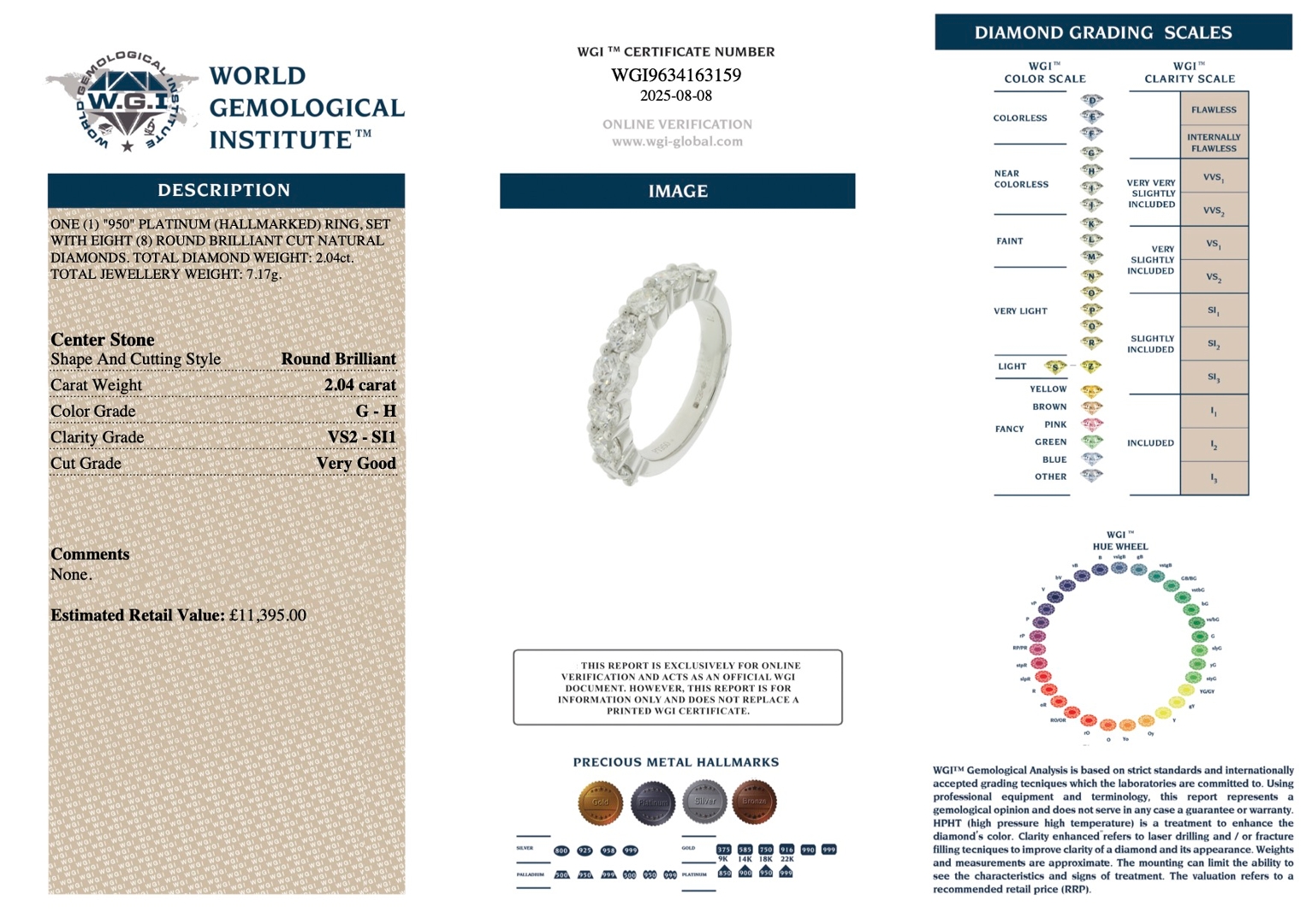 A brand-new, unused, certified platinum eight-stone eternity ring, this striking piece is set with a continuous row of brilliant-cut natural diamonds weighing a total of 2.04 carats. Each diamond, carefully matched in VS2–SI1 clarity and G–H colour, has been selected for its sparkle and vibrancy, creating a seamless band of brilliance across the finger. The incredible sheen and enduring strength of platinum form the perfect setting, complementing the stones' fire and ensuring the design retains both its elegance and durability. With its classic proportions and impressive diamond weight, this ring is a refined choice that balances luxury and timeless style.