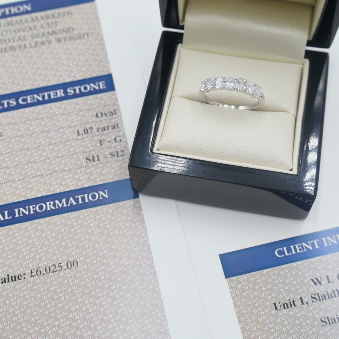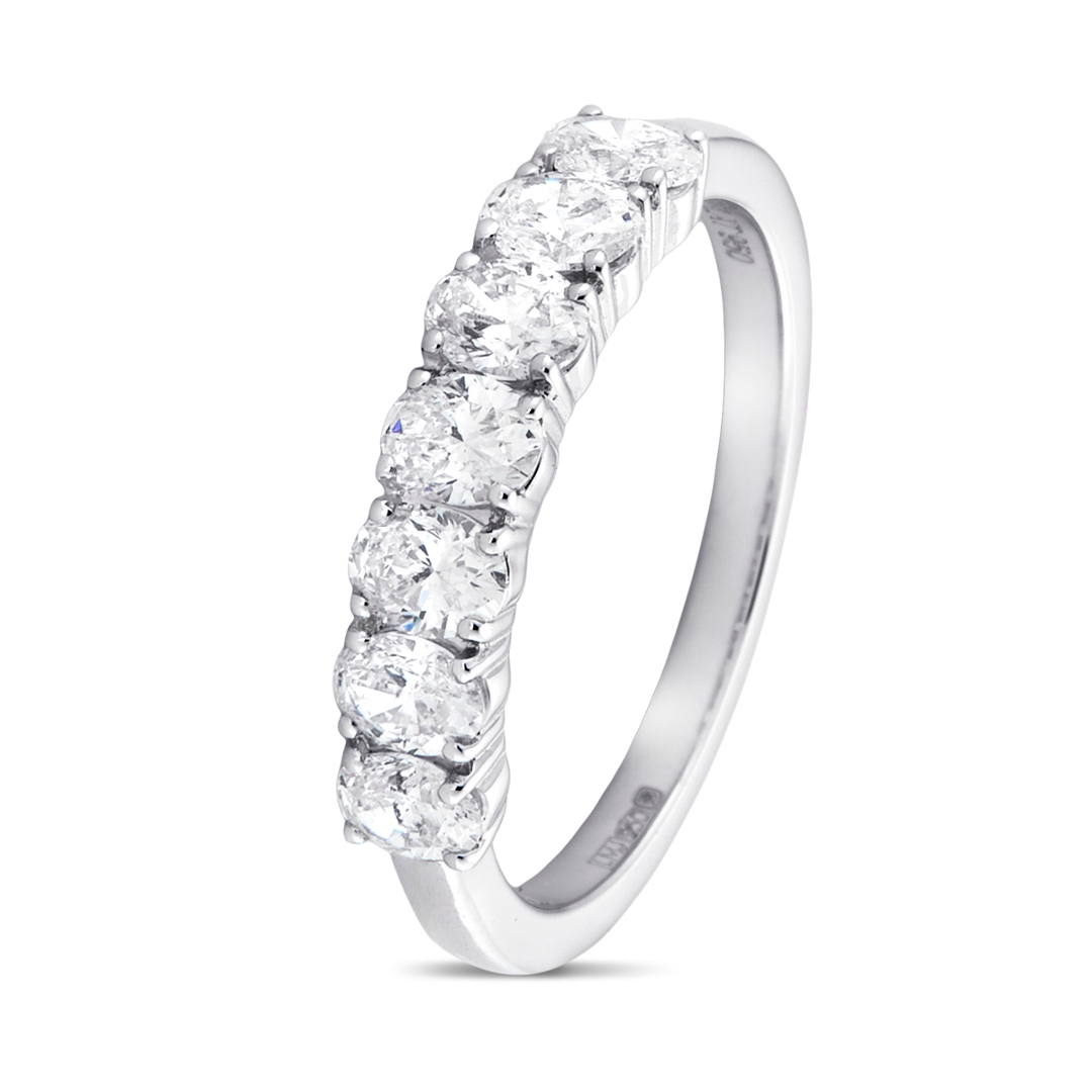 A brand-new, unused, certified platinum seven-stone eternity ring, this elegant design is set with seven oval-cut natural diamonds, totalling 1.07 carats. Each stone, graded SI1–SI2 in clarity and F–G in colour, has been carefully chosen to provide a consistent sparkle and bright presence across the finger. The elongated shape of the oval cut enhances light flow, creating a refined brilliance that distinguishes this style from traditional cuts. Platinum, with its enduring strength and cool lustre, forms the perfect setting to complement the natural fire of the diamonds, resulting in a ring that is both sophisticated and timeless.