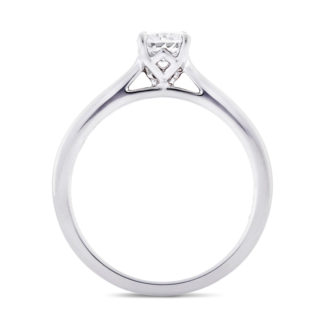 A brand-new, unused platinum solitaire engagement ring, certified and set with a dazzling natural diamond that radiates classic beauty. A 0.50ct brilliant-cut diamond is at the centre, carefully selected for its exceptional sparkle and enduring charm. Graded G for colour and SI1 for clarity, this stone offers crisp, near-colourless brilliance with minimal inclusions visible only under magnification, ensuring a bright, lively presence that catches the light from every angle.