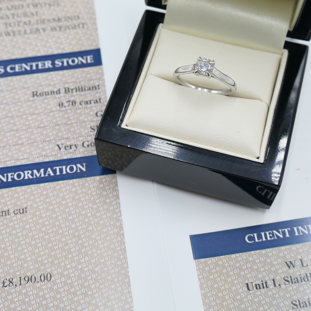 A brand-new, unused certified platinum natural diamond solitaire engagement ring that showcases refined simplicity with a touch of delicate sparkle. At the heart of this timeless piece is a 0.70ct brilliant-cut natural diamond, graded G for colour and SI3 for clarity. Bright and full of life, this centre stone offers a clean, elegant look with a classic sparkle that captures attention with every movement. Adding a subtle layer of brilliance, two smaller brilliant-cut diamonds are set within the primary setting, totalling 0.01 ct. Graded G–H for colour and SI in clarity, these accent stones provide just the right amount of detail to elevate the design without overwhelming its classic silhouette.