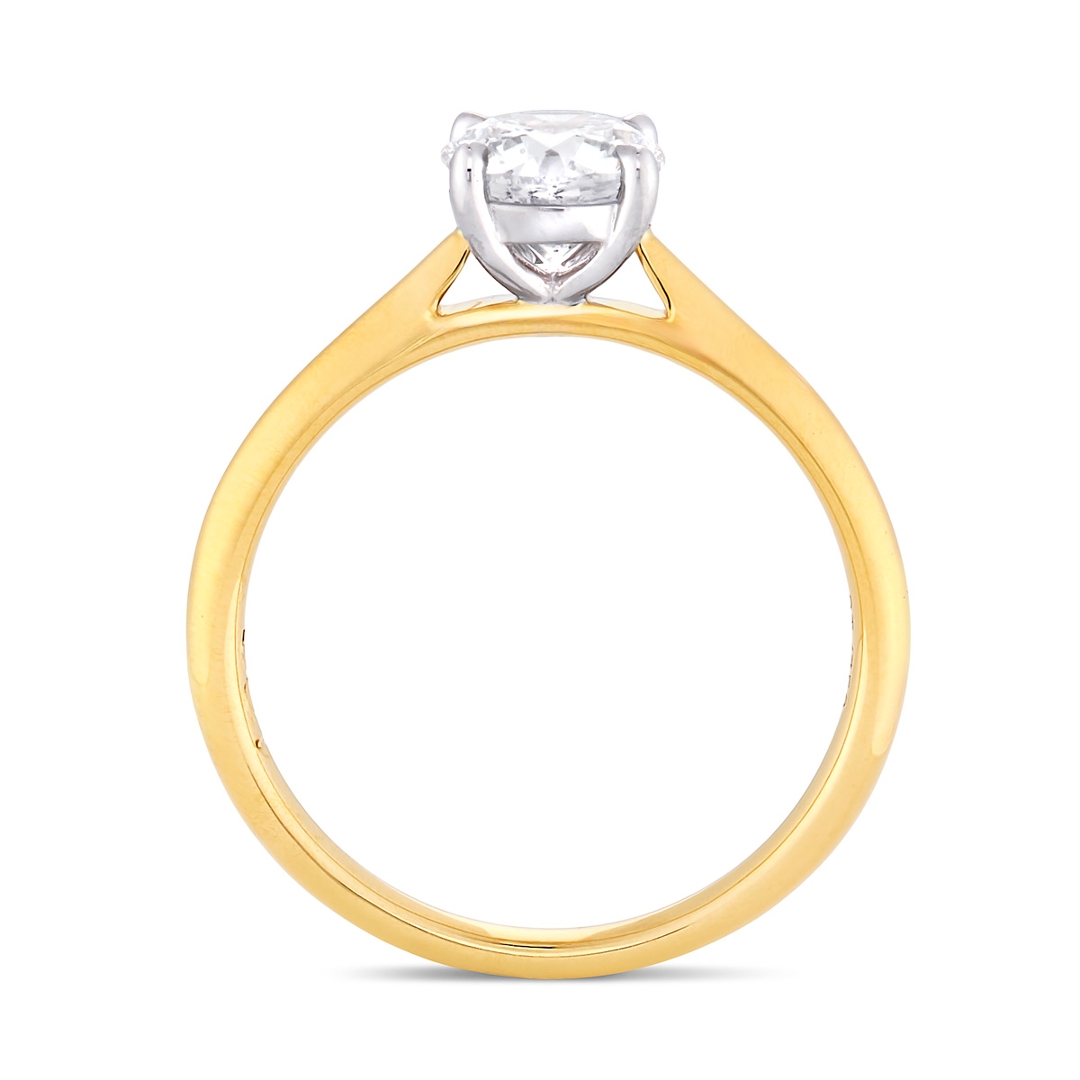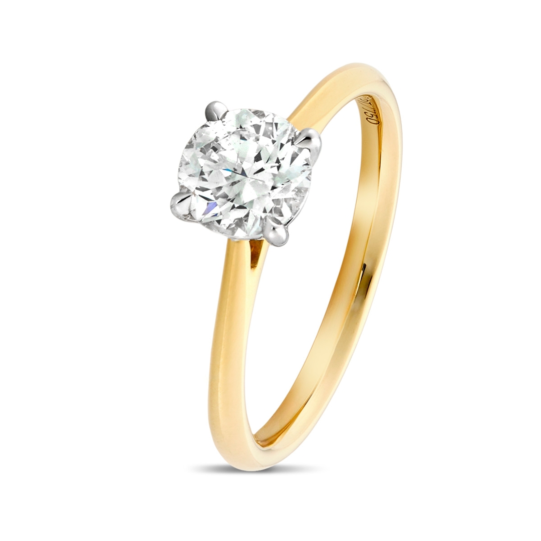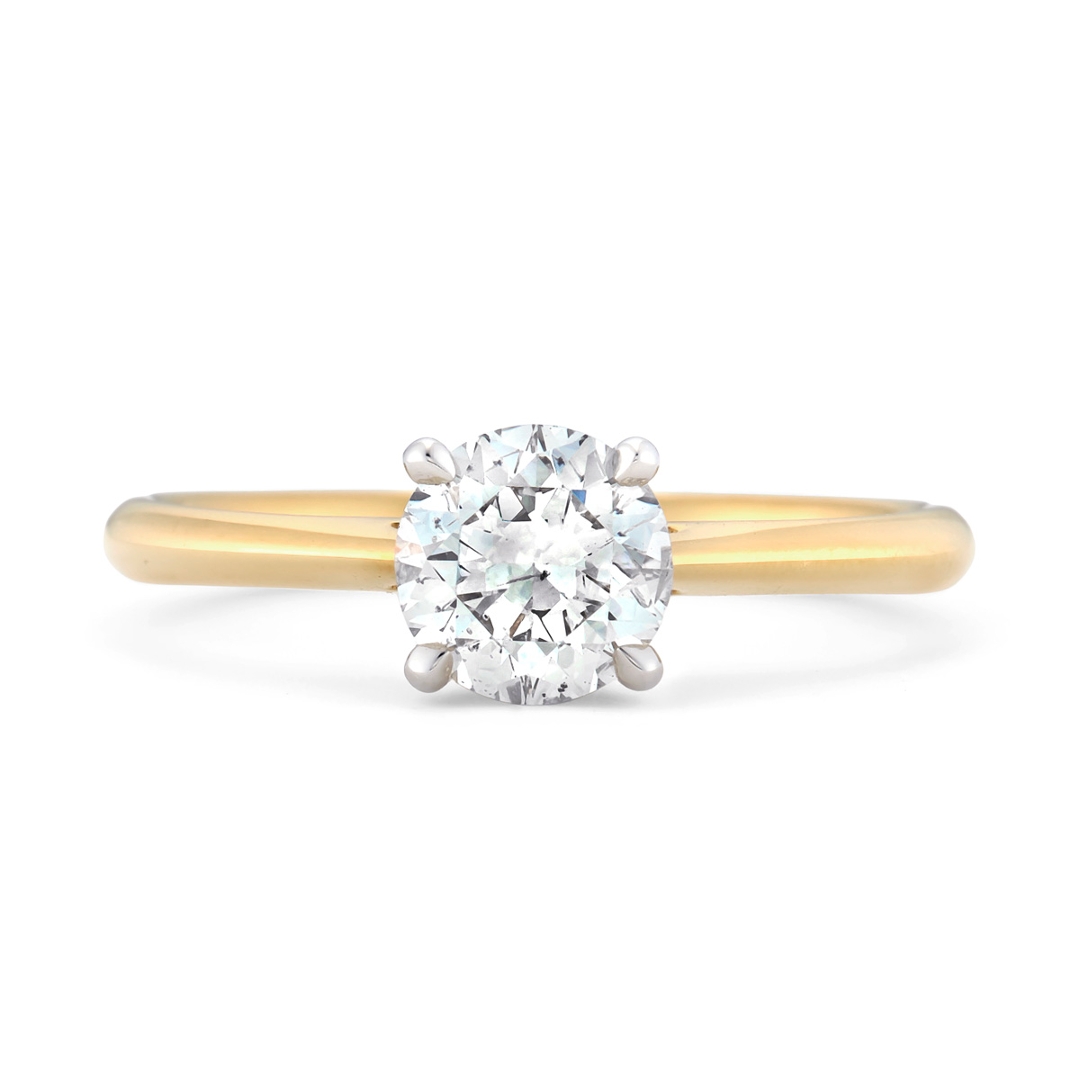 A brand-new, unused, certified natural diamond solitaire engagement ring, set with one brilliant cut diamond at the centre, set in platinum & 18ct yellow gold.