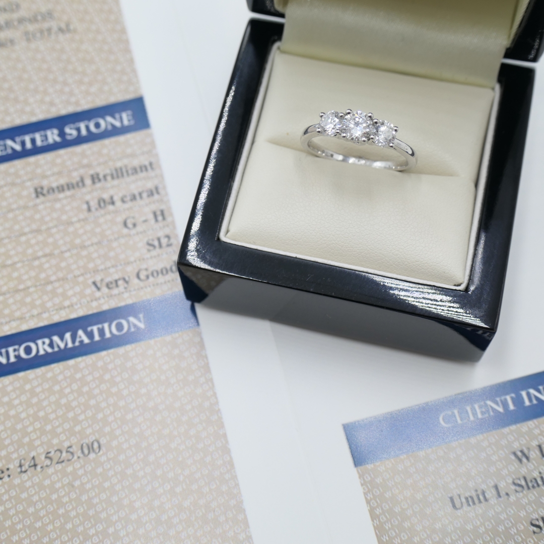 A brand-new, unused certified natural diamond three-stone eternity ring that beautifully symbolises love, unity and everlasting commitment. This elegant design features three brilliant-cut natural diamonds, perfectly matched and expertly set in platinum. The diamonds, with a combined weight of 1.04ct, are graded G–H in colour and SI2 in clarity, offering a captivating sparkle and balanced brilliance that catches the light from every angle. The trio of stones represents the past, present and future, making this ring a meaningful and timeless choice. Crafted in platinum, a metal prized for its purity, strength and enduring shine, the setting enhances the diamonds’ radiance while providing exceptional durability. With a total weight of 4.42 grams and a professional valuation of £4,525, this ring reflects superior craftsmanship and refined sophistication.