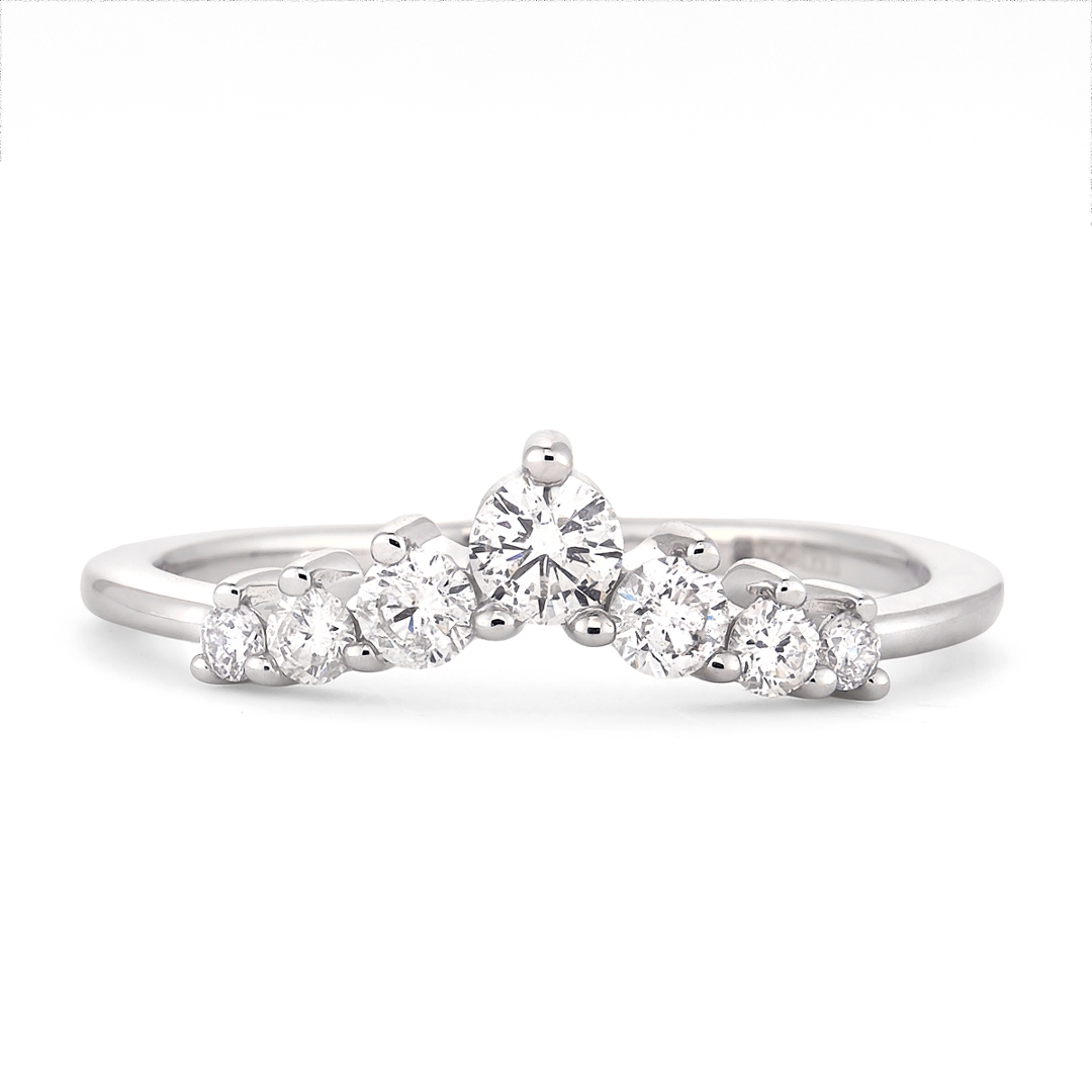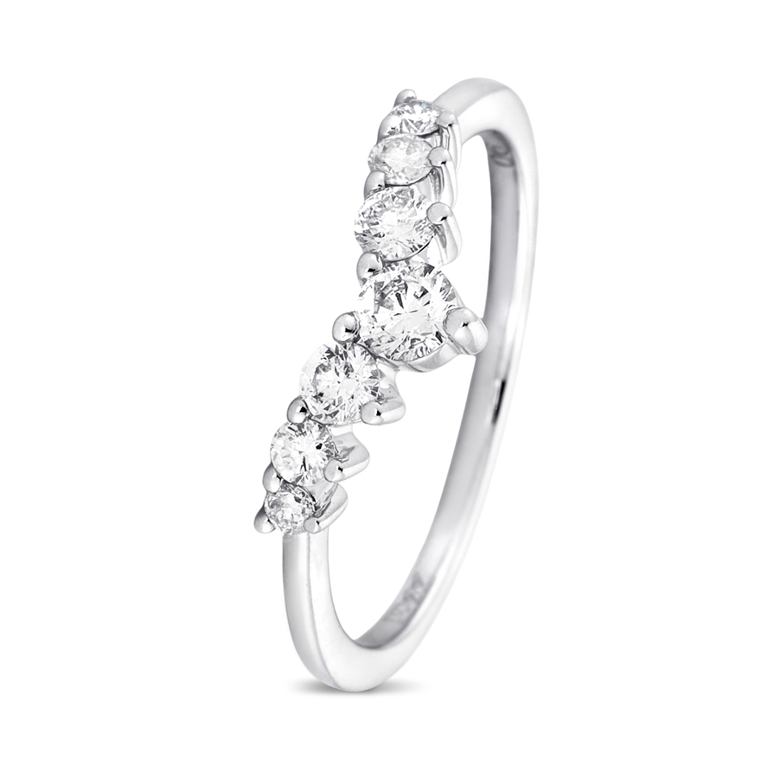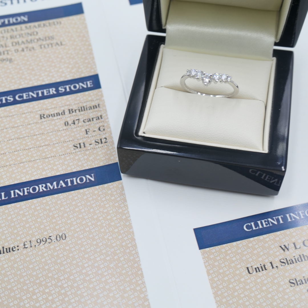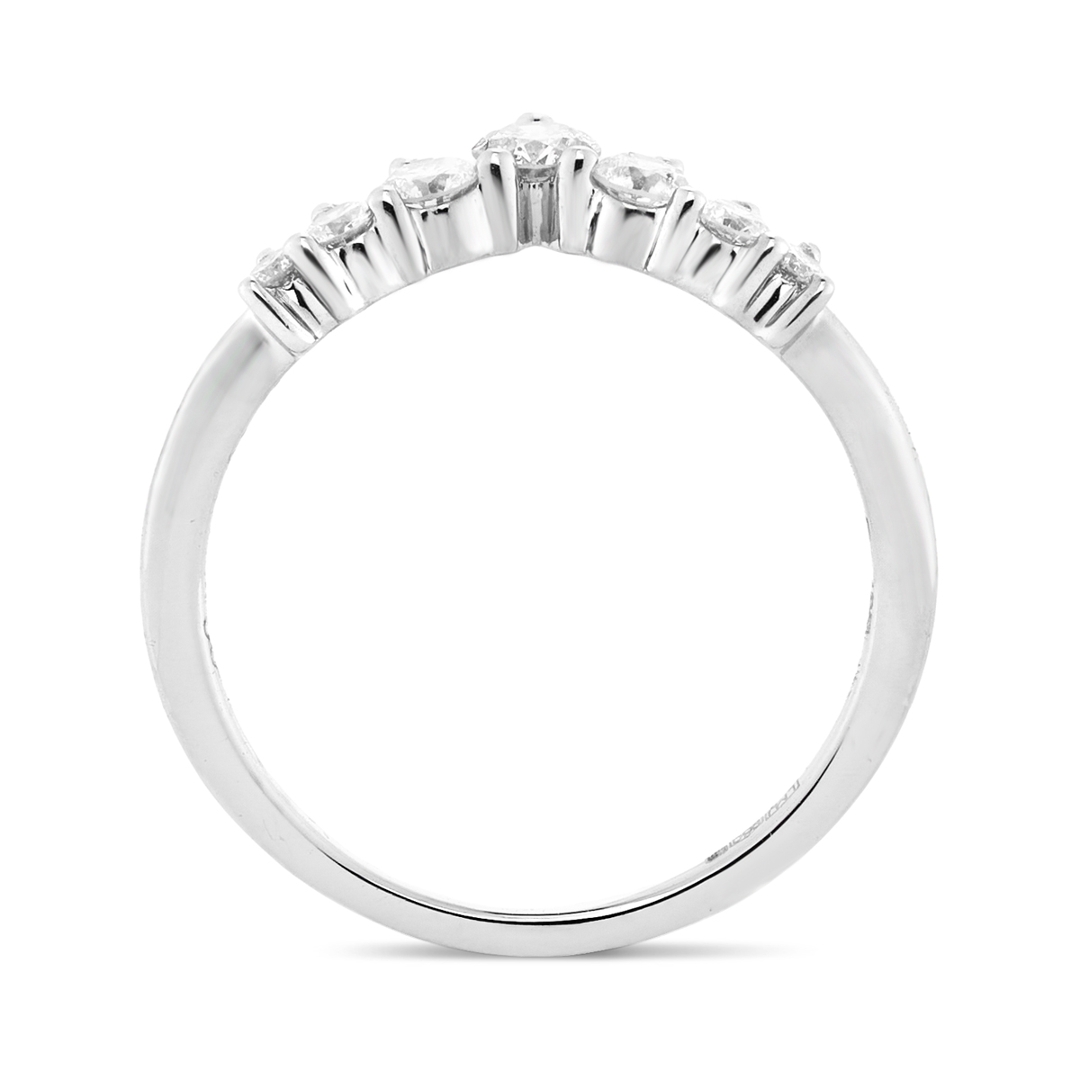 A brand-new, unused platinum natural diamond wishbone eternity ring, set with seven round brilliant-cut diamonds that total 0.47 carat in weight. Each diamond, graded F–G in colour and SI1–SI2 in clarity, has been carefully chosen for its natural sparkle and lively brilliance. The platinum setting enhances the stones' crisp fire, while the wishbone shape adds a graceful elegance that can be worn as a stand-alone statement or paired with other bands. With a total weight of 2.99g, the ring combines refined craftsmanship with the durability expected from a piece designed to last for generations.