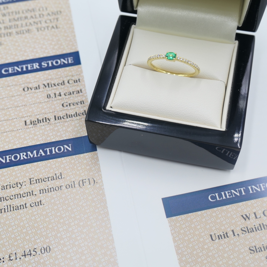 A brand-new, unused certified 18ct yellow gold cluster ring that combines timeless design with the elegance of natural gemstones. At its heart lies a delicate 0.14ct oval mixed-cut emerald, celebrated for its vibrant green hue and natural allure. The emerald is complemented by a refined arrangement of 0.13 ct round brilliant-cut diamonds, carefully set along the shoulders to create a balanced, graceful sparkle. With a diamond colour grade of F–G and clarity SI1–SI2, the stones capture and reflect light beautifully, elevating the emerald’s lively tone.