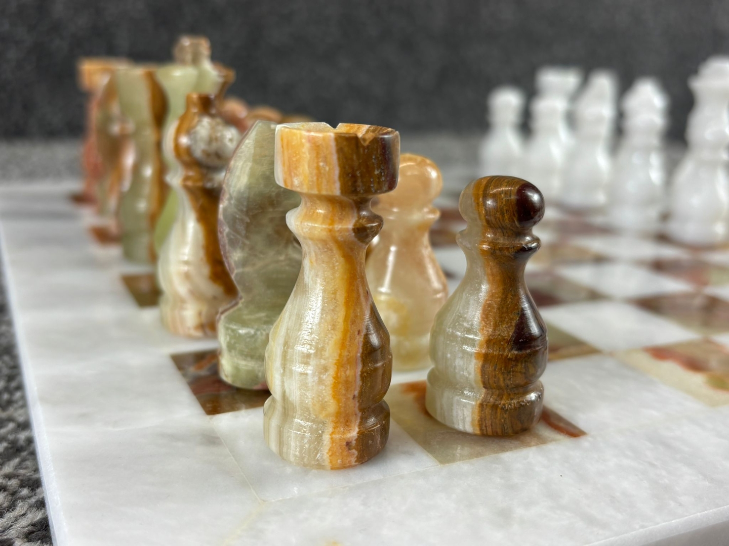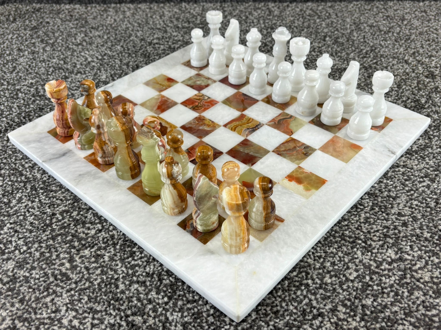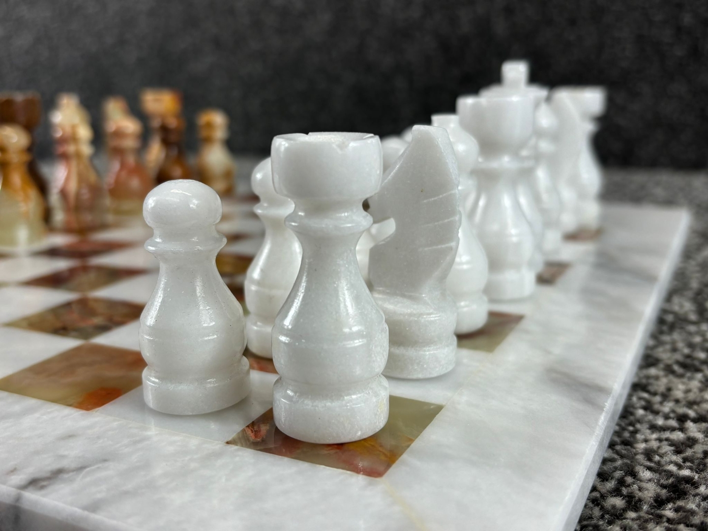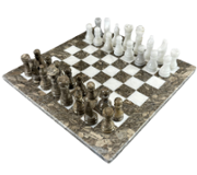 A brown and white hand carved marble chess set that showcases both artistry and functionality. Each piece has been carefully shaped from natural marble, featuring warm, earthy browns contrasted beautifully with smooth white stone. The natural veining and variation in the marble make every figure unique, while the solid weight of the pieces adds a touch of luxury to each move. Measuring approximately 12 inches by 12 inches, the set offers the perfect balance between playability and compact display.